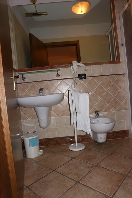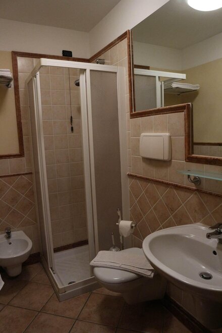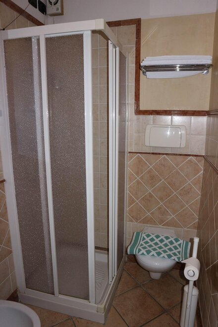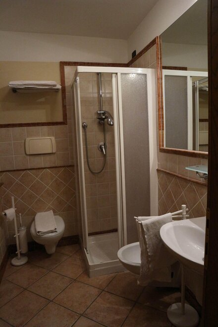 shower, wash stand, toilet, bidet, running hot/cold water