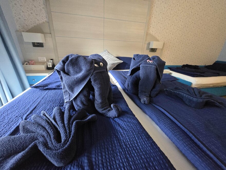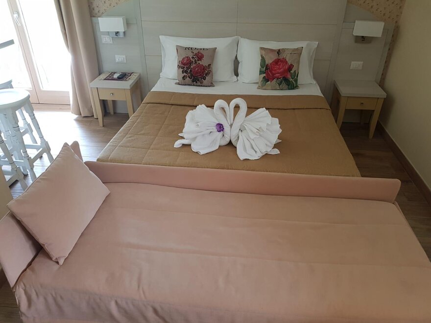 The service for the rooms includes: breakfast, air conditioning, WI-FI, hairdryer, TV, bed and bath linen (large, small, and medium towels), weekly bed linen change, daily tidying and final cleaning, play area, parking, and indoor storage for sports equipment (bicycles, motorcycles, boards…)