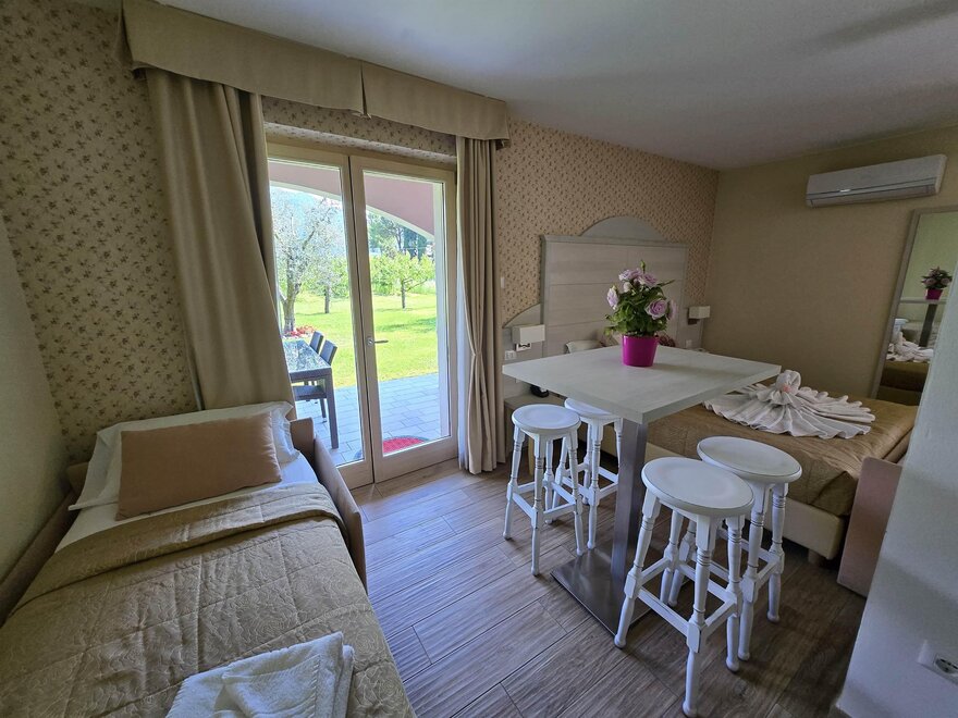 The room service includes: breakfast, air conditioning, kitchenette, WI-FI, hairdryer, TV, bed and bath linens (large, small, and medium towels), weekly linen change, daily tidying, and final cleaning, play area, parking, and indoor storage for sports equipment (bicycles, motorcycles, boards...)