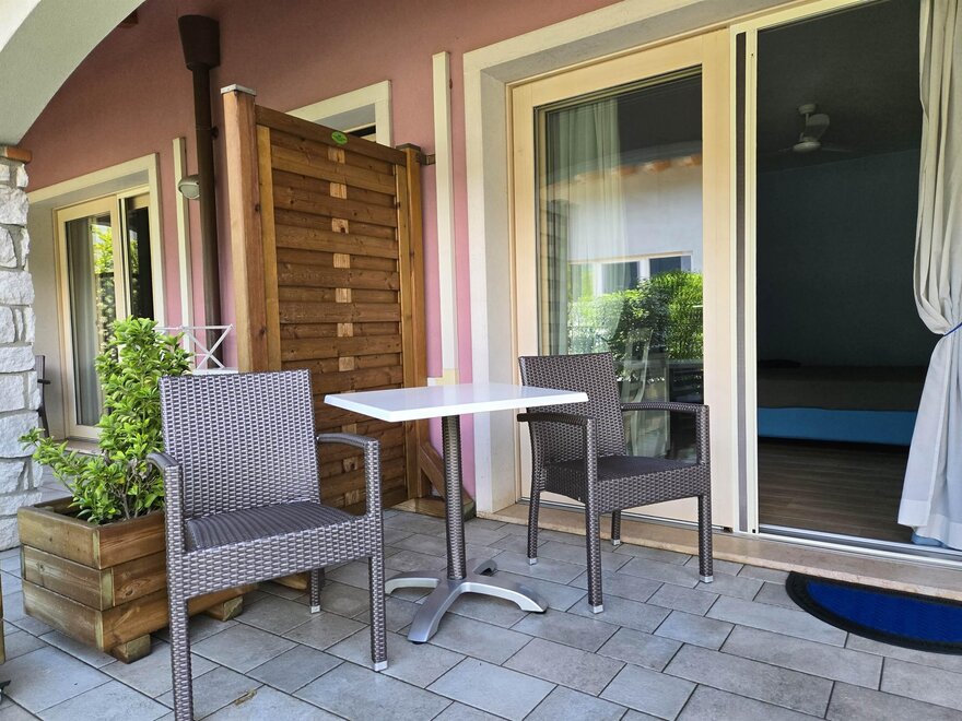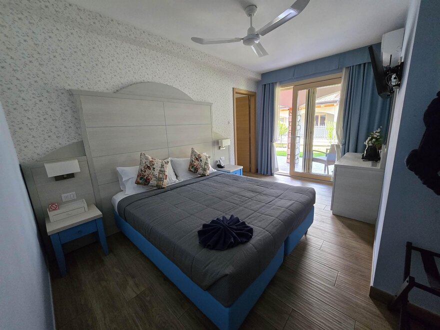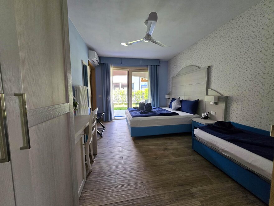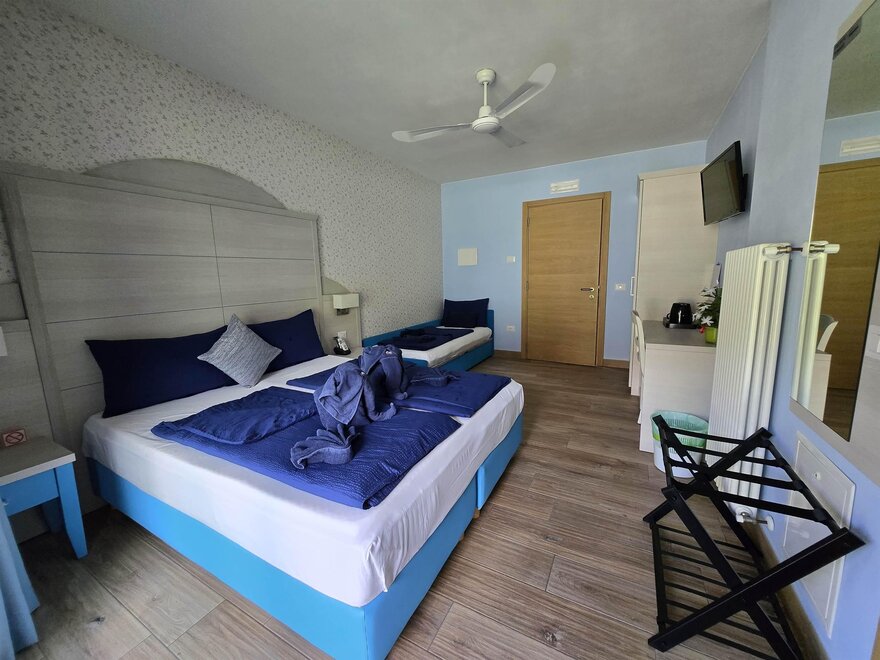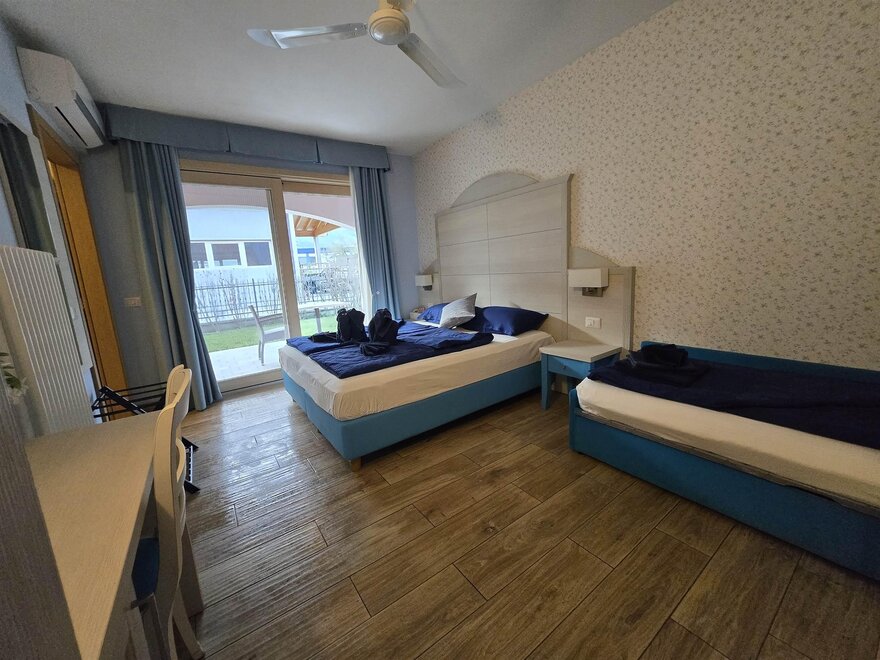 The service for the rooms includes: breakfast, air conditioning, WI-FI, hairdryer, TV, bed and bath linen (large, small, and medium towels), weekly bed linen change, daily tidying up, and final cleaning, playground area, parking and indoor storage for sports equipment (bicycles, motorcycles, boards…)