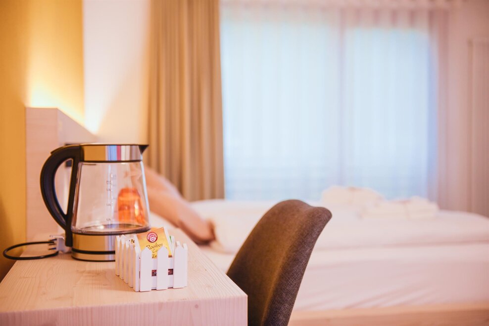 Double bed and balcony overlooking the vineyards and surrounding mountains: the Zelvet, Celva, Volpis and Doss rooms keep our promise of tranquility, with particular attention to comfort thanks to their minimal and modern design.