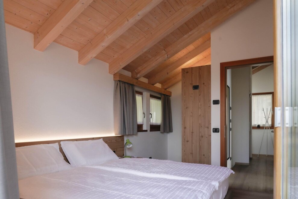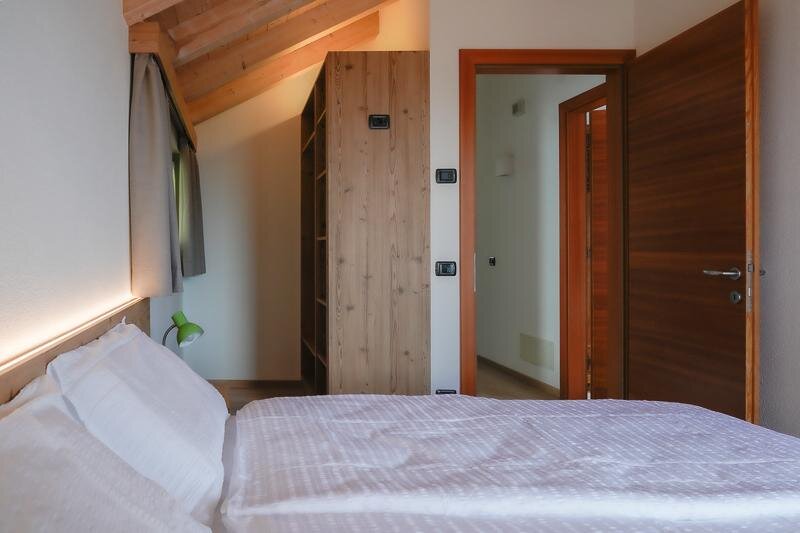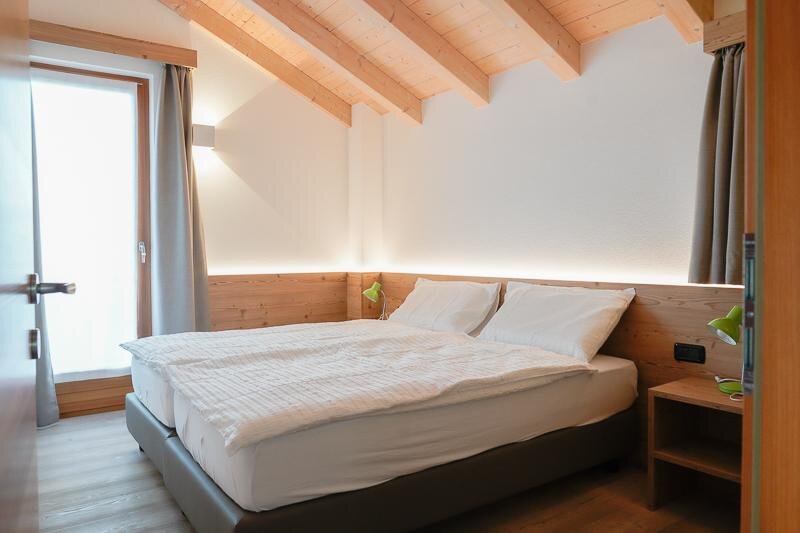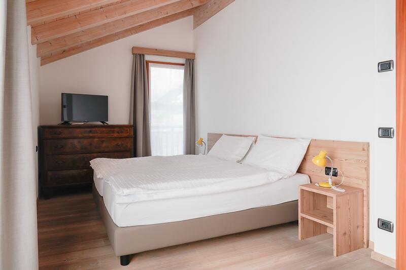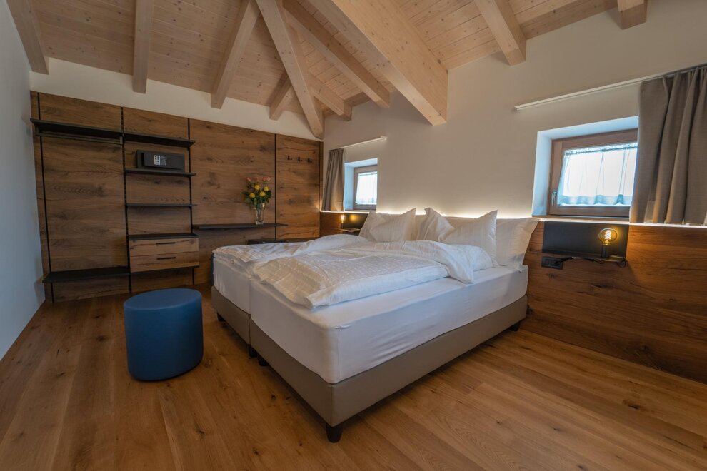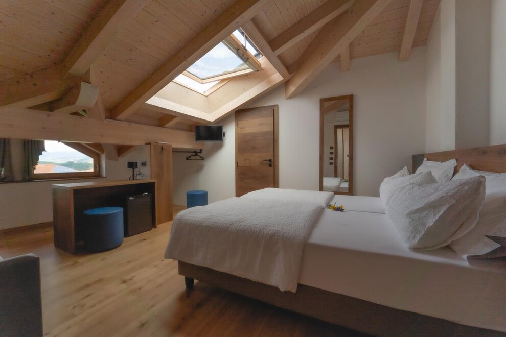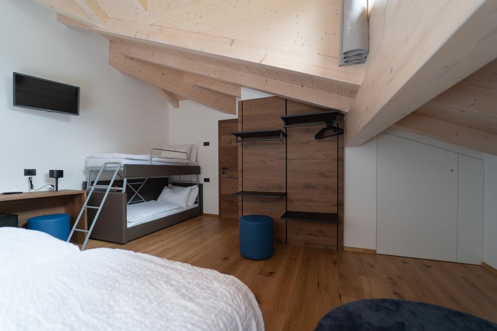 Double attic room with private bathroom (32 sqm) for 2/4 people with bunk beds. The rooms are furnished in a modern, wooden style and are equipped with desk, safe, fridge bar, TV, free Wi - fi, hairdryer, air conditioning/heating. On request it is possible to have a crib (0-3 years old).