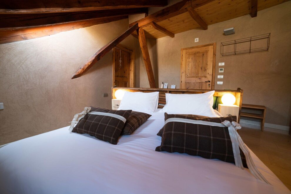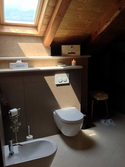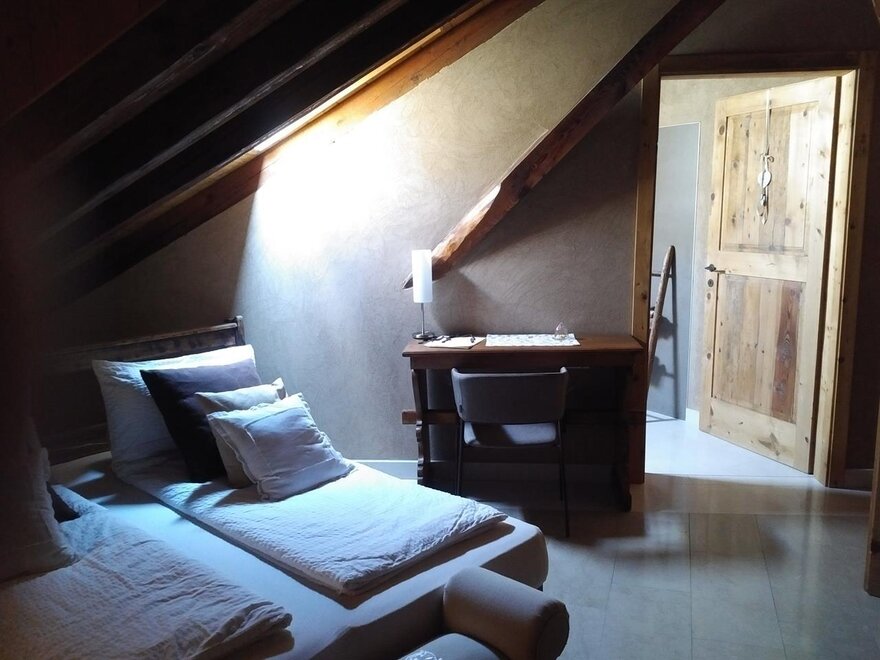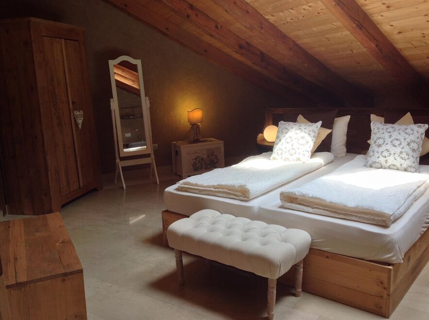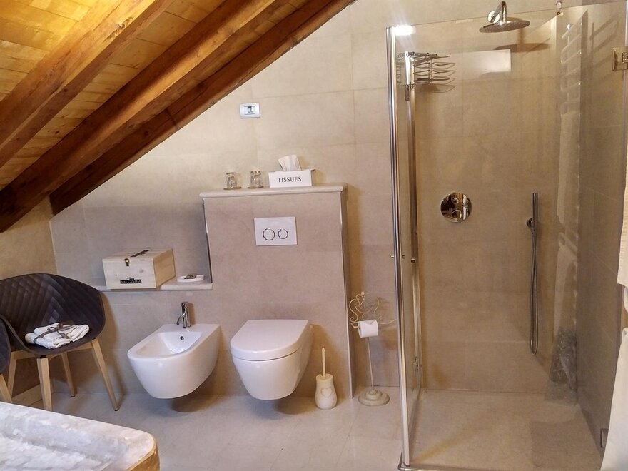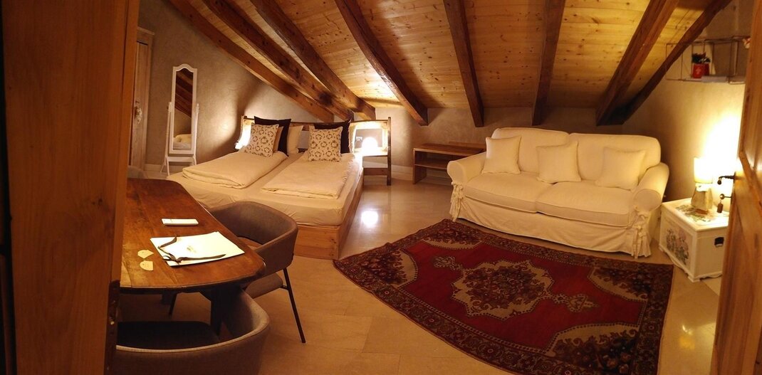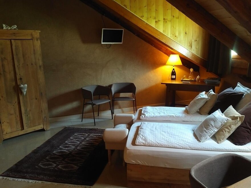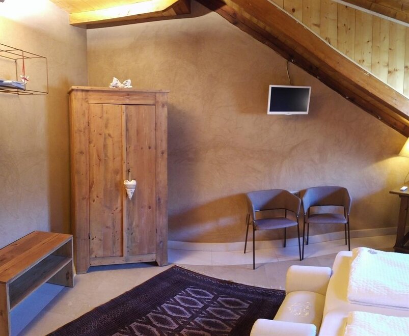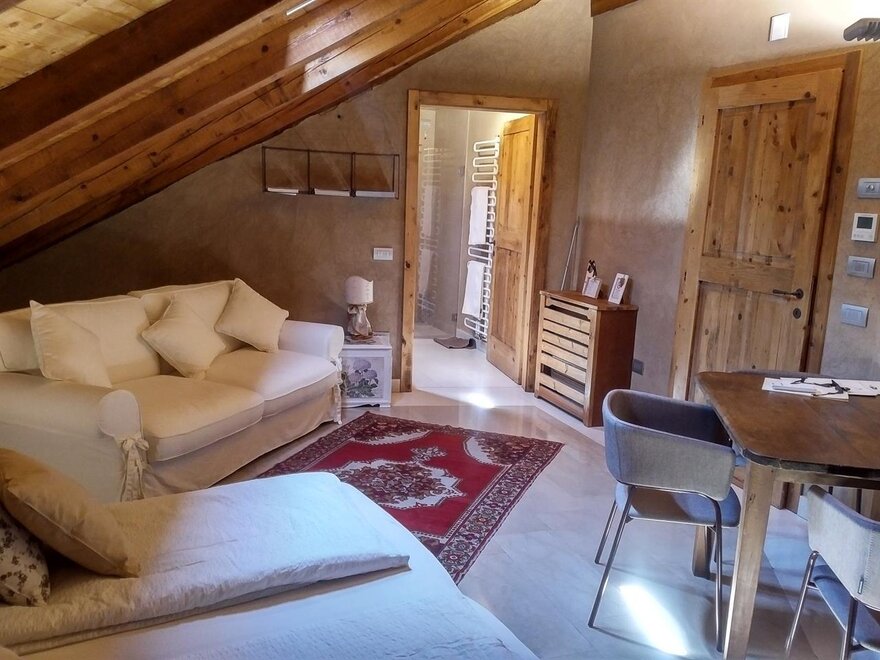 The Marzemino room is perfect for two people but also for three, has a beautiful and comfortable sofa bed. There are two suggestive windows in the roof and the bathroom, also a window in the roof, has a stone sink that once stood in the farmhouse that houses the farm. Marzemino is the name of the typical wine of our valley, Vallagarina. The walls are all built with clay. you will find the radio in the room and in the room, air conditioning, WiFi, cookies of welcome and handmade furniture with the wood of the old farm.