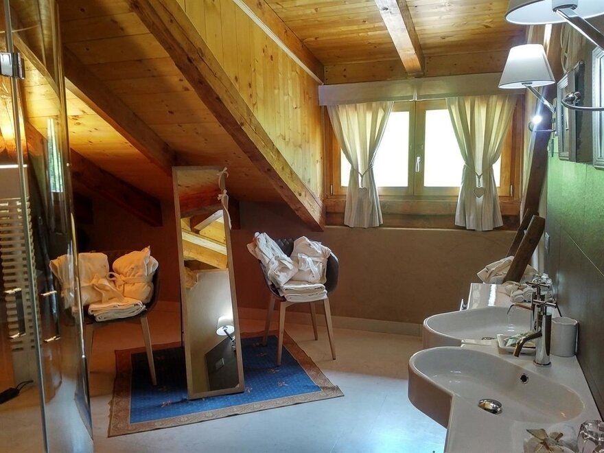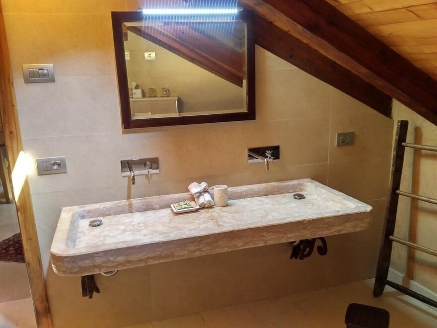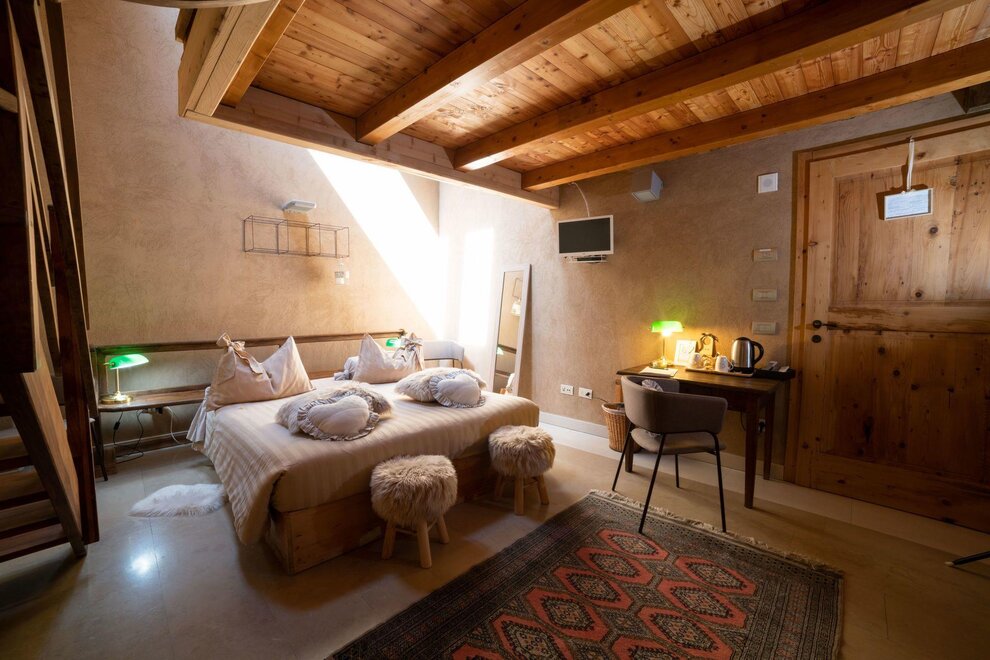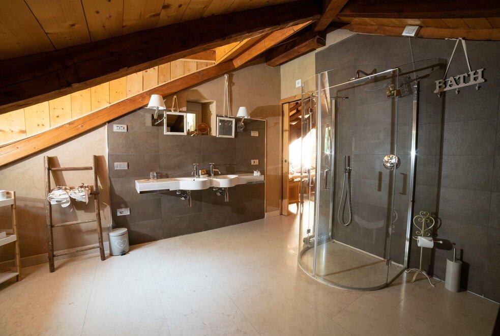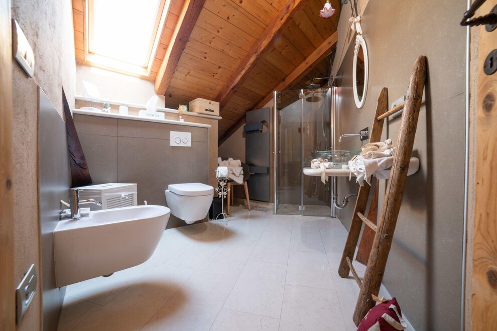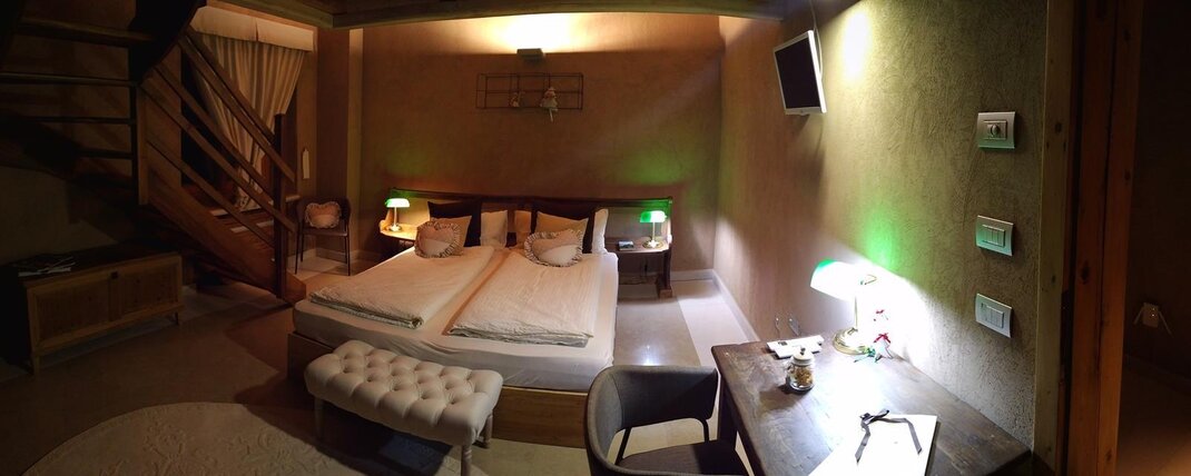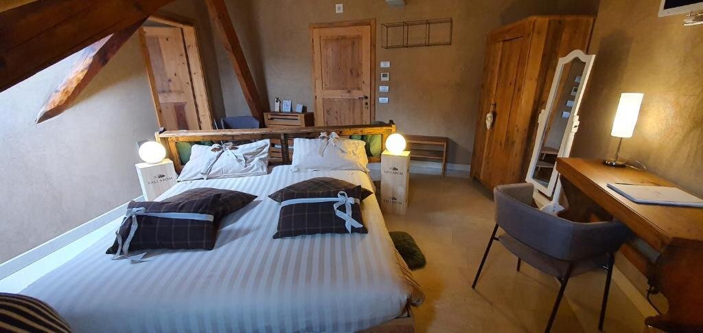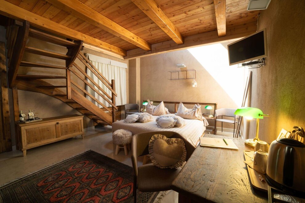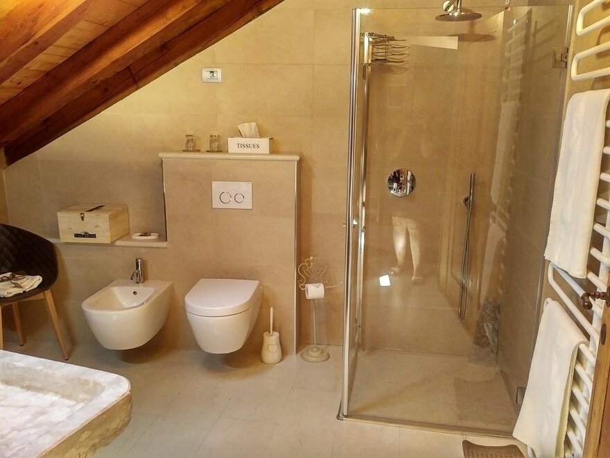 The Marzemino room is perfect for two people but also for three, has a beautiful and comfortable sofa bed. There are two suggestive windows in the roof and the bathroom, also a window in the roof, has a stone sink that once stood in the farmhouse that houses the farm. Marzemino is the name of the typical wine of our valley, Vallagarina. The walls are all built with clay. you will find the radio in the room and in the room, air conditioning, WiFi, cookies of welcome and handmade furniture with the wood of the old farm.