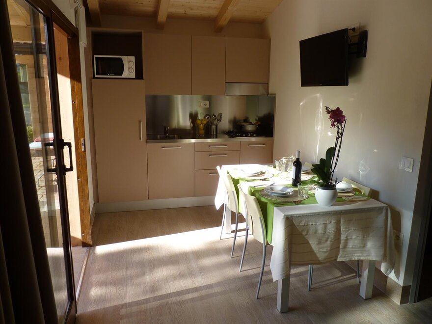 The “Prabi” mini apartments, in brick, are perfect for having all the comforts of home, allowing you an authentic camping experience. Surrounded by beautiful lush vegetation, the two-bedroom apartments with private bathroom can accomodate maximum four people and are equipped with safe, heating, bed linen, towels, blankets, television with satellite antenna and an equipped kitchenette (fridge, hob, microwave, crockery and kettle). They have a covered veranda with table and chairs to spend the days sitting outside with freinds and family and a private parking spot.