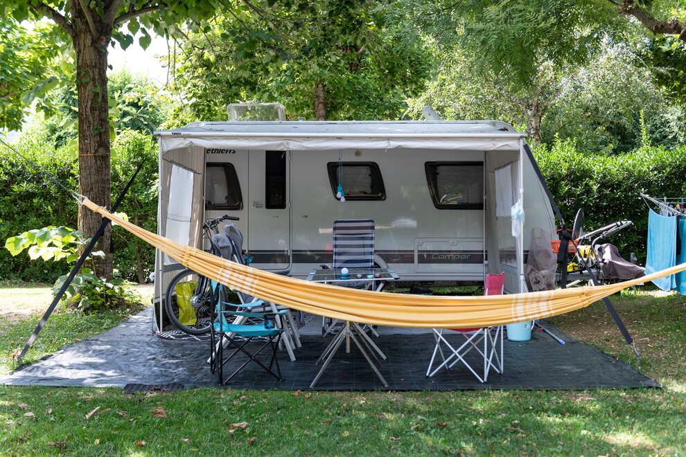 electrical connection, paved access, treed camping site, flat ground, shady camping site, waste water, size in square meters: 80, grassy area