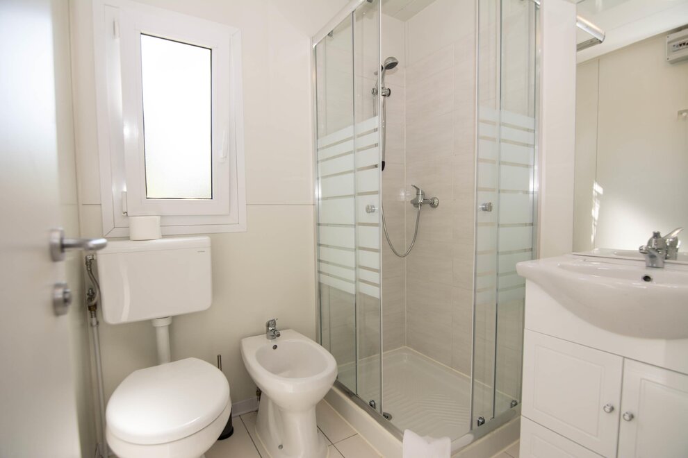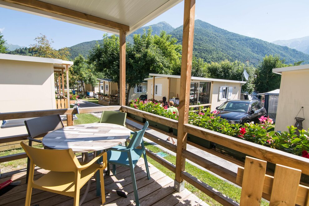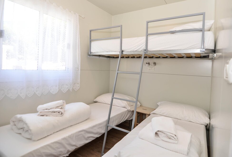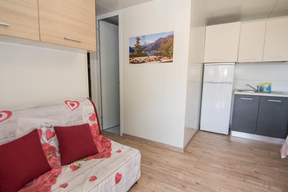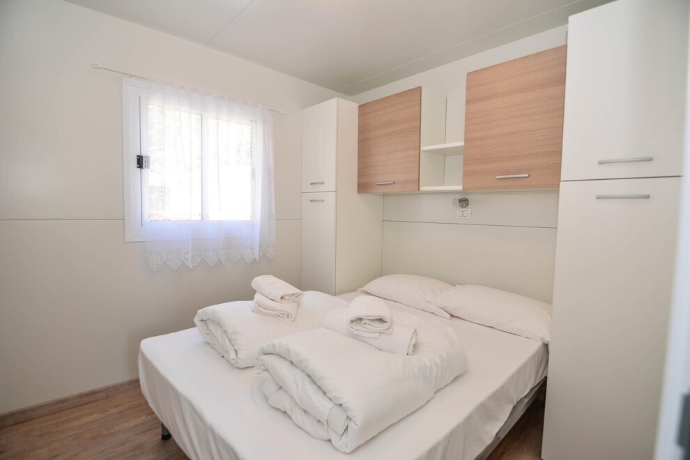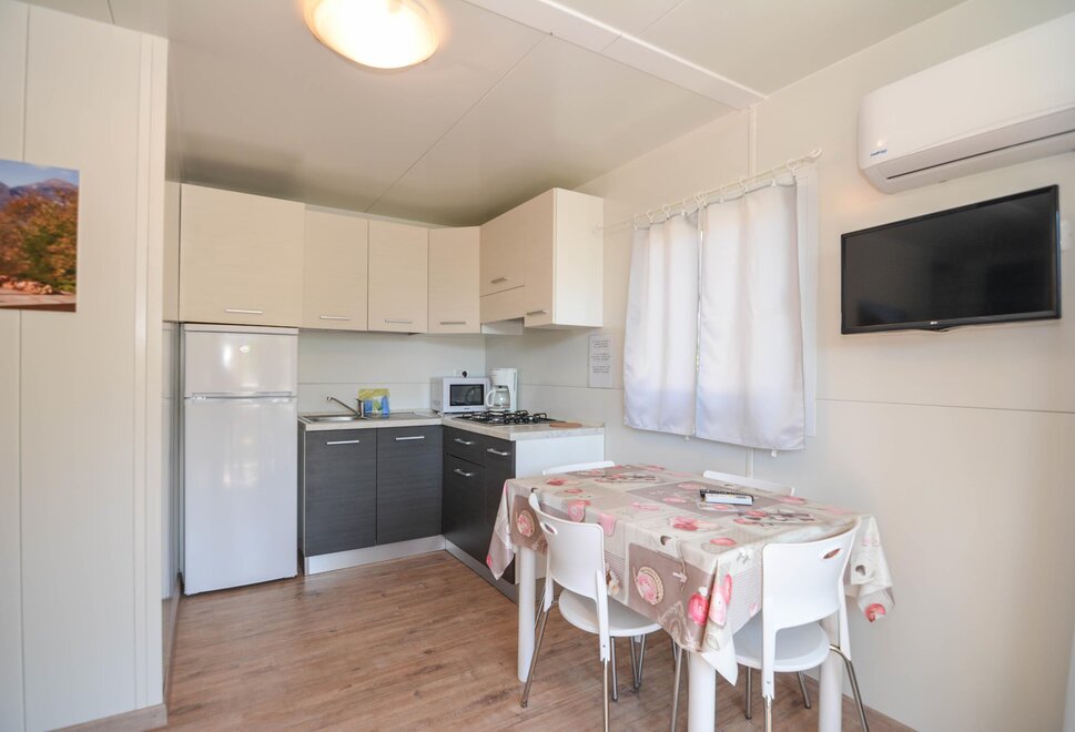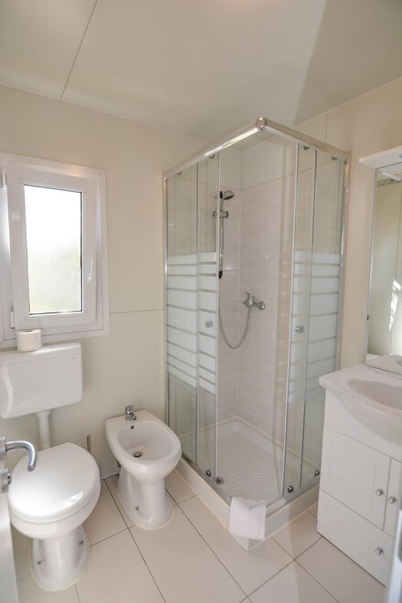 10 new Mobilhomes, in a modern style furnished and equipped with all comforts. Living room with kitchenette, double sofa bed, fridge with freezer, German coffee machine, microwave, air conditioning/heating, TV-Sat, two separate bedrooms, one with double bed and one with two or three single beds, bathroom with shower. Outside Veranda with table and chairs. Parking