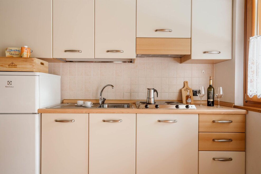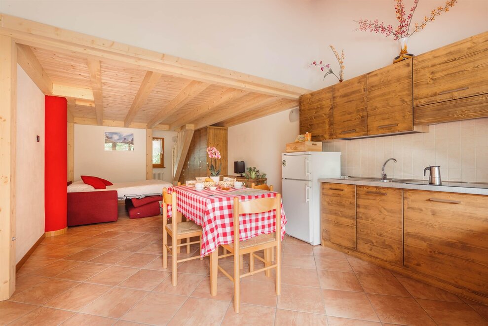 The apartments are located on the first floor of the building to the south of the camping. There's also a lift, perfect for people with disabilities. Each apartment is an open-space unit with a fully equipped kitchenette, bathroom with shower box, 4 beds and the possibility of adding another one, TV and independent heating (in the winter season ). Furthermore you will be provided with bed linen, tablecloth and dish rag, 2 towels per person and bath mat.