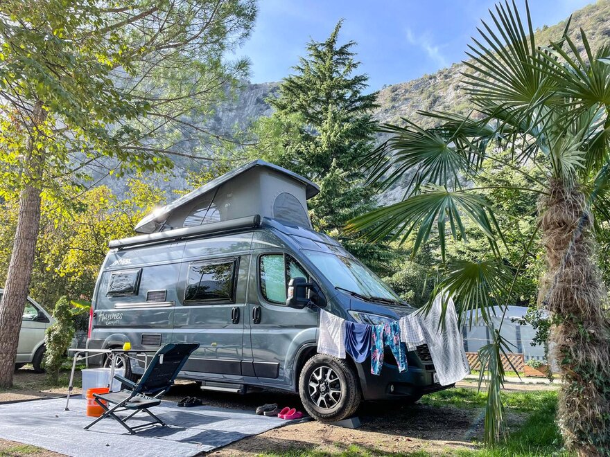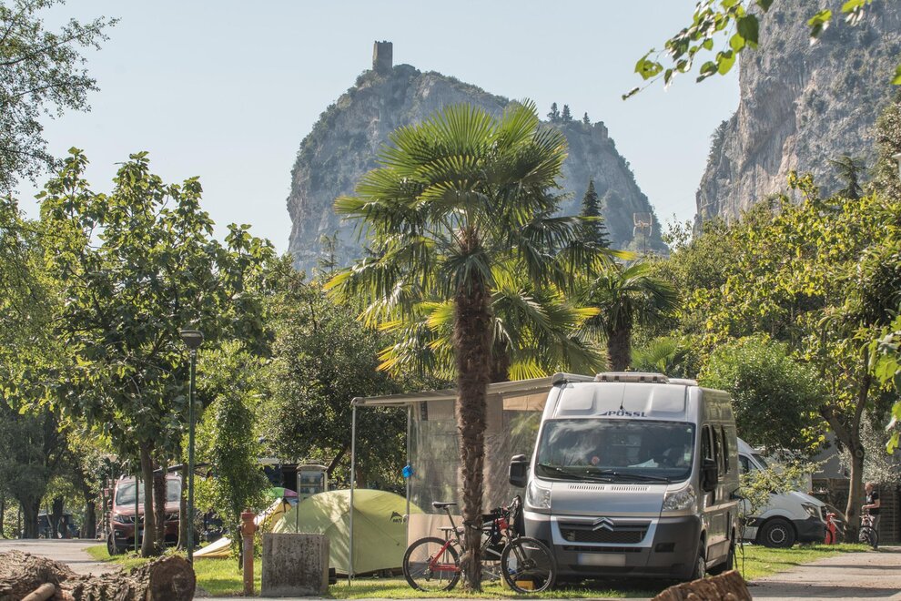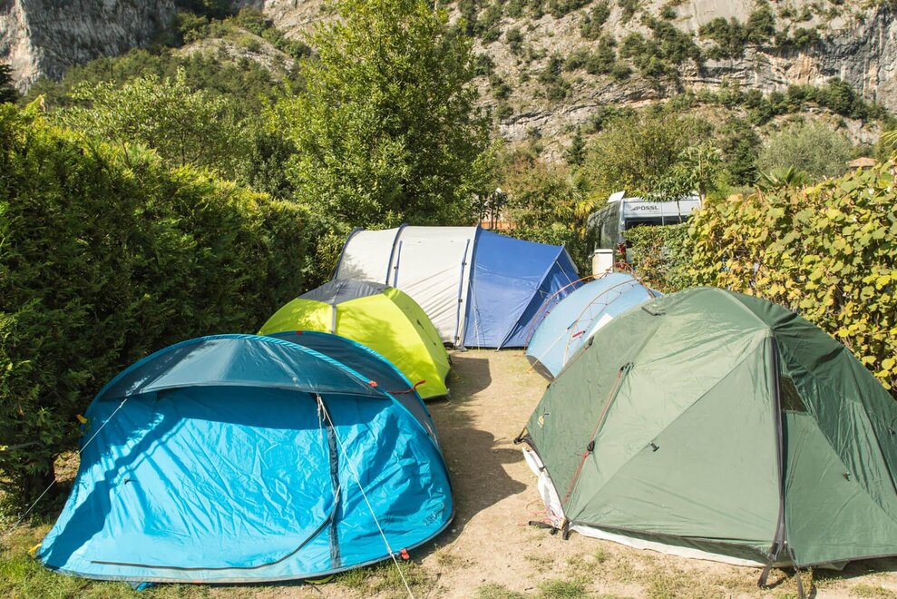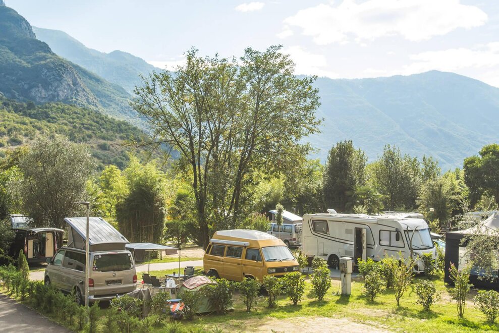 The Comfort River Side Pitch (45-60 sqm) is the ideal solution if you want to enjoy your coffee while watching and hearing the river flow along the entire coastline of Camping Zoo in Arco.