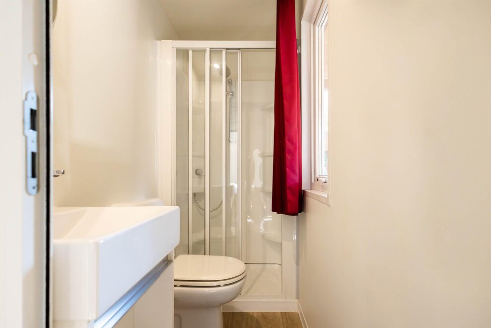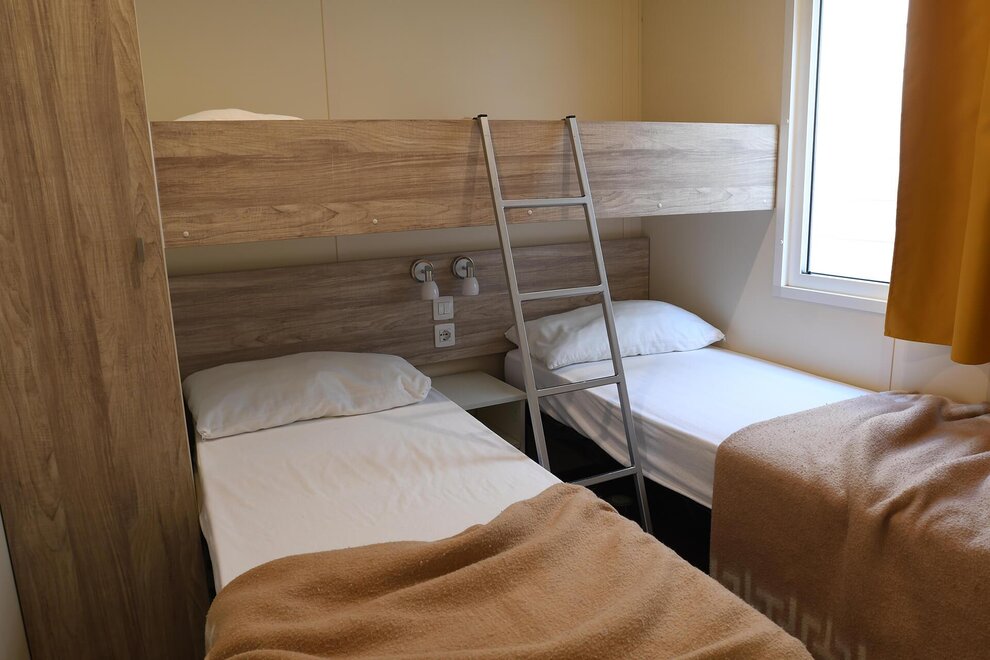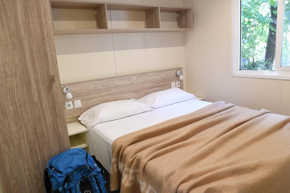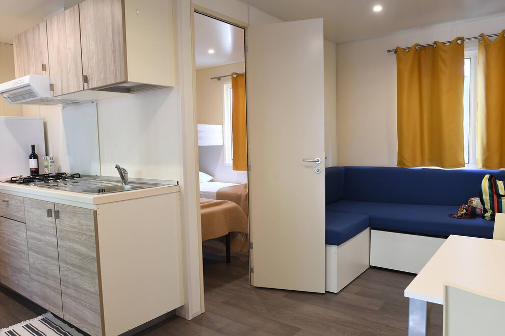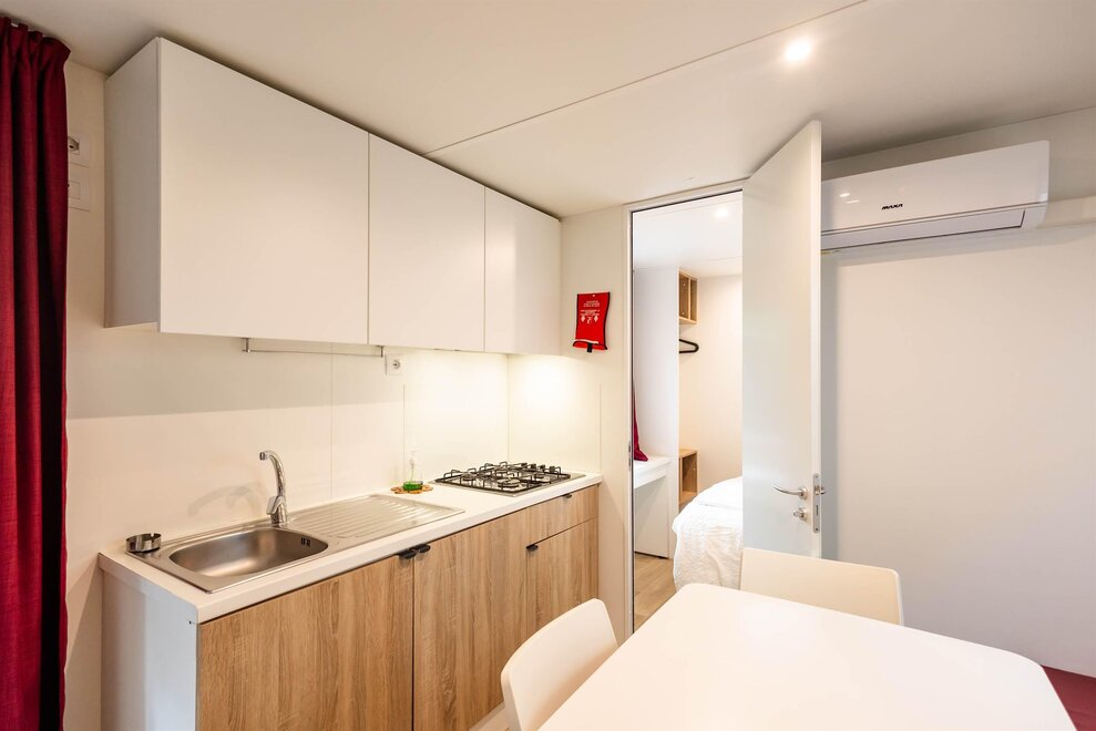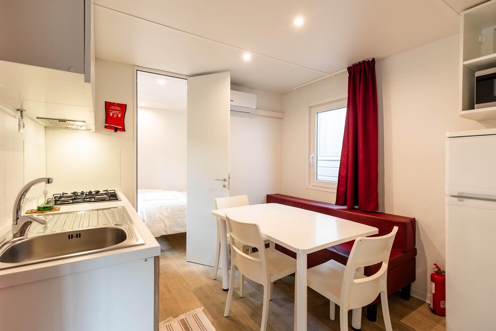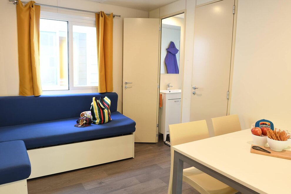 The ALPHA mobile home is a spacious 30sqm accommodation equipped with all the comforts. It can accommodate up to 5 adults and one child, and outside you will also find a large patio with table and benches.