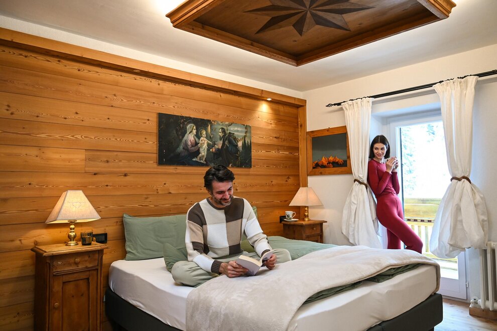 Double room, dedicated to couples, NO possibility of having two separate beds. On request possibility of adding a cot. The bathroom has a shower. Sunny private balcony on which to relax. Wooden furniture and natural larch wood flooring, for a pleasant comfort. Wardrobe and heating. Surface between 12/14 square meters Our rooms lack the TV as we have chosen to give you a truly rejuvenating experience even for the mind. Indeed, in our rooms you will find a kit of games and activities to do together with your companion. Choose from different rooms: from standard to superior to dorms.