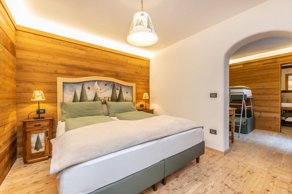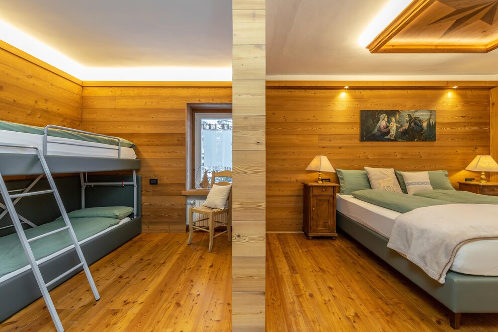 Room suitable for a family or a group of 4 people; accommodation in a double bed, which can be arranged in two singles, plus a bunk bed. En-suite bathroom with shower. Natural larch wood flooring. Room with two panoramic windows. Surface of 20 square meters Our rooms lack the TV as we have chosen to give you a truly rejuvenating experience even for the mind. Indeed, in our rooms you will find a kit of games and activities to do together with your companion. Choose from different rooms: from standard to superior to dorms.
