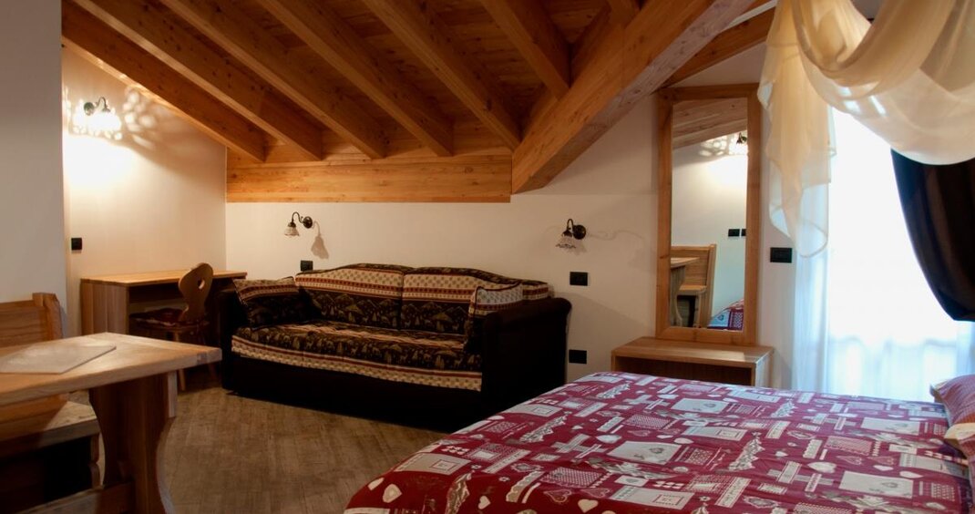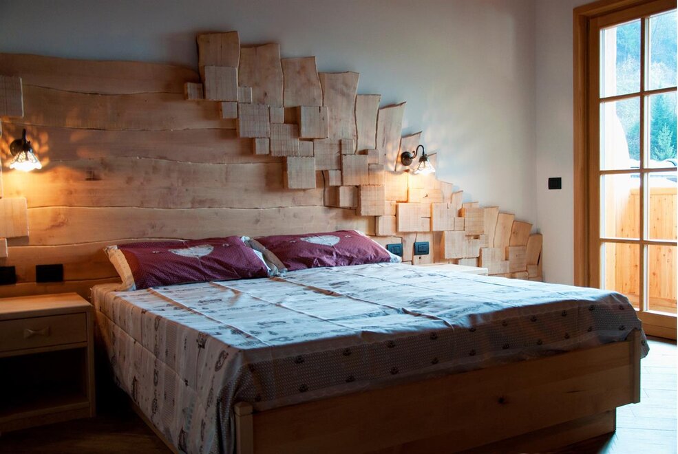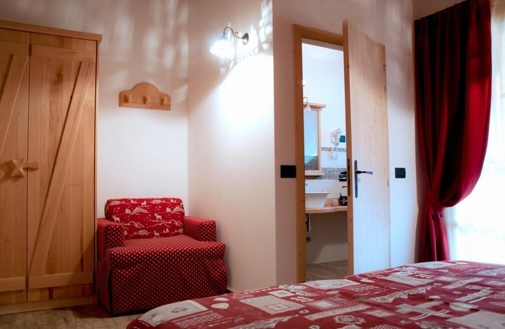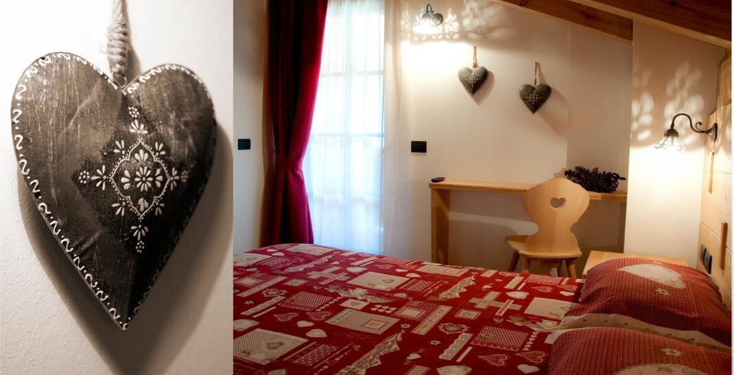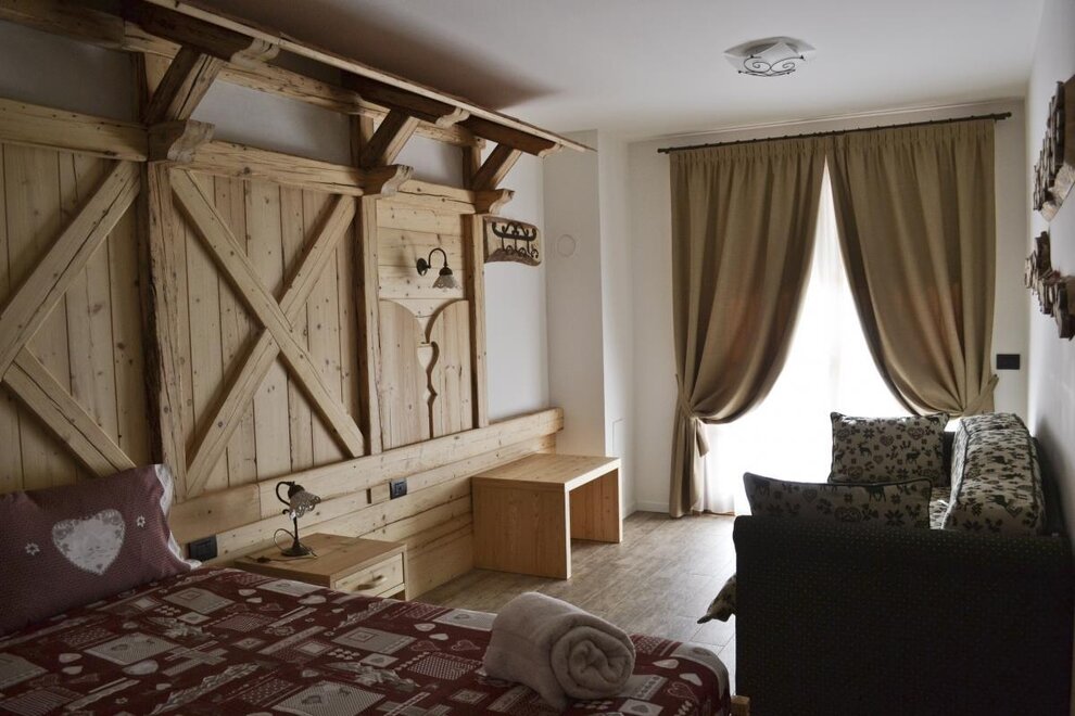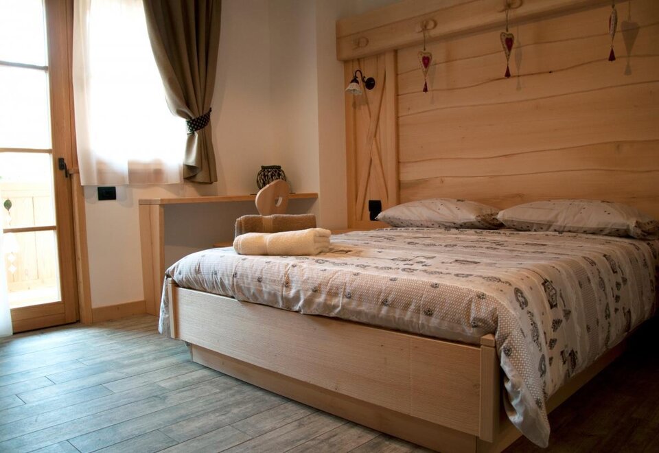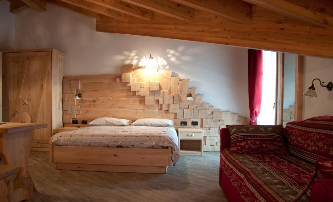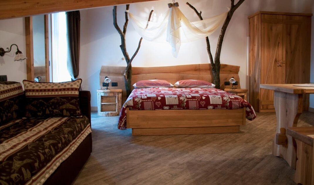 The Millefiori room bears the name of the honey of the millefiori of our mountains. In a rustic and romantic style, it recalls the characteristics of our huts; It is completely furnished in fir wood, clear with reddish veins.