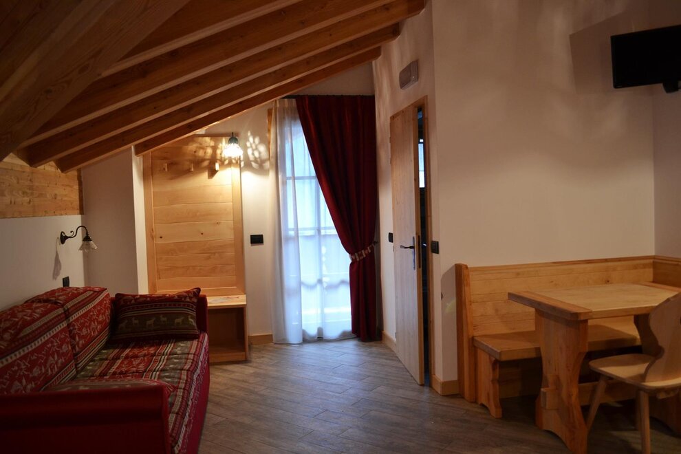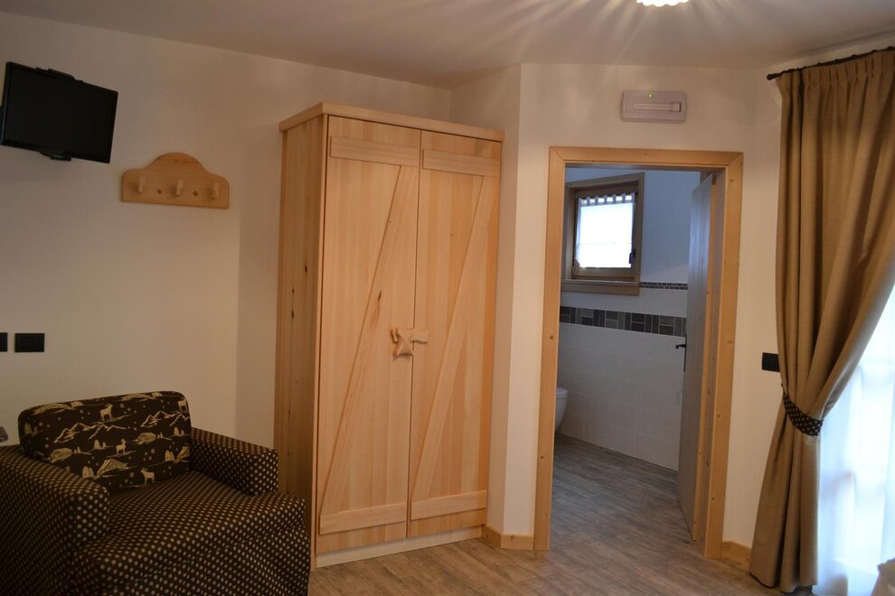 Furnished in alder wood, with shades from pale yellow to rosy white, it enjoys the wonderful vistadella Presanella peak, admirable from the independent balcony.
