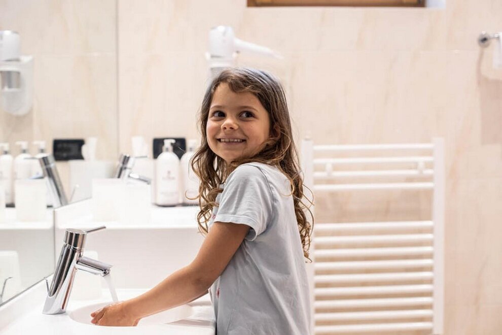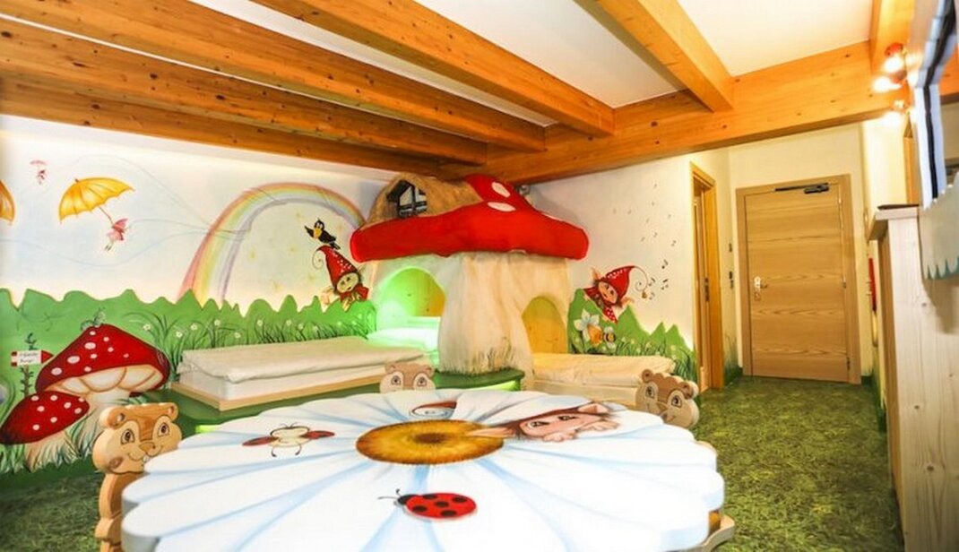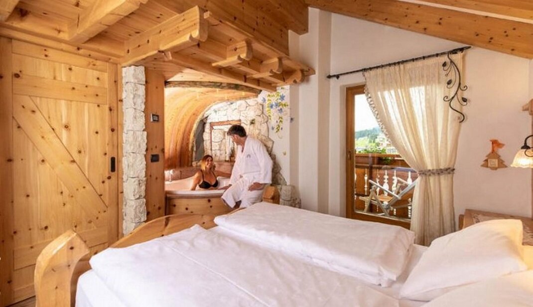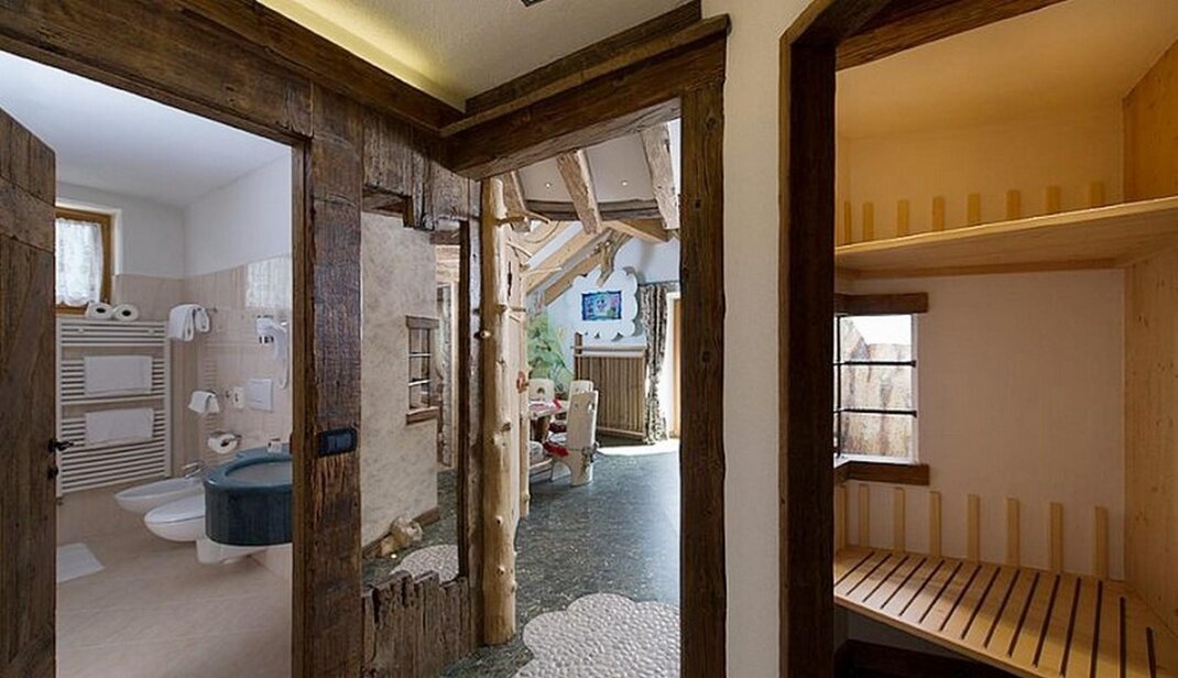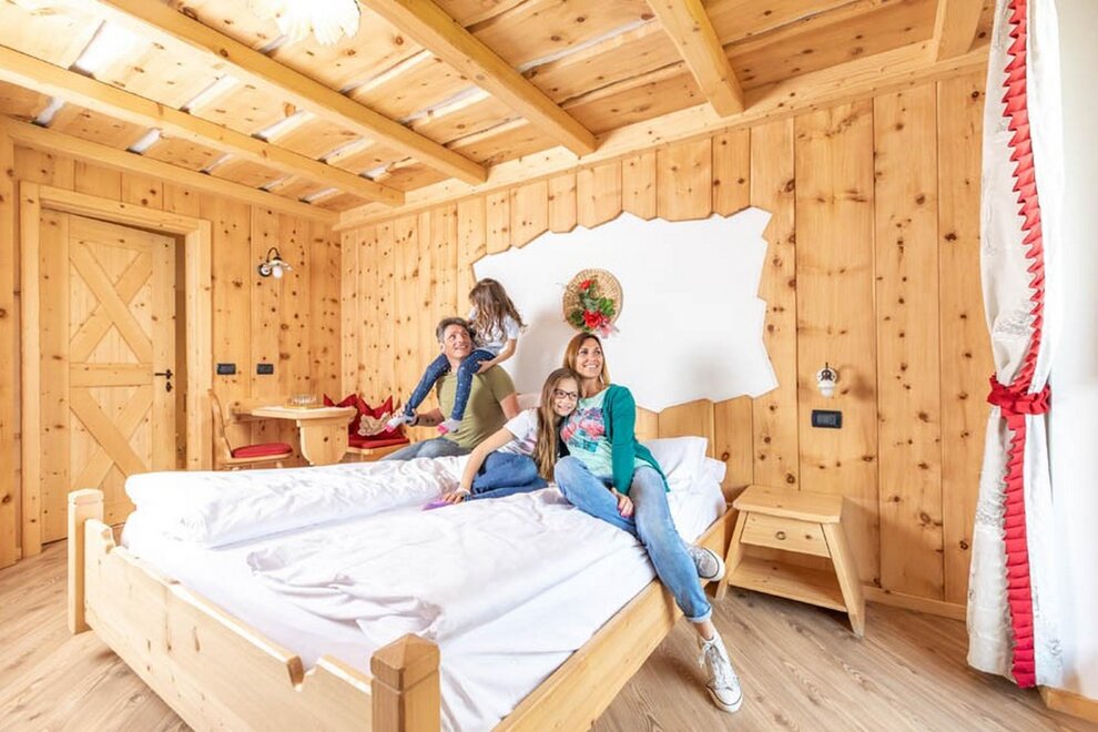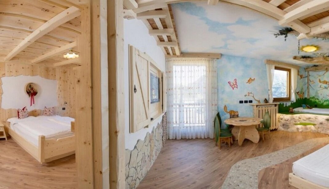 The Farm Suite: Discover our Farm! The Farm Suite is like living on a real farm. Plenty of surprises in the children’s rooms: a slide (yes, a slide in the room!), a bridge to cross imaginary rivers and little friends to play with. Plus, on the walls, paintings of the Dolomites and a blue sky recreate the feeling of playing outdoors! Intimacy and warmth in Mum and Dad’s room: a whirlpool bath, the fragrance of wood and togetherness with soft lighting.