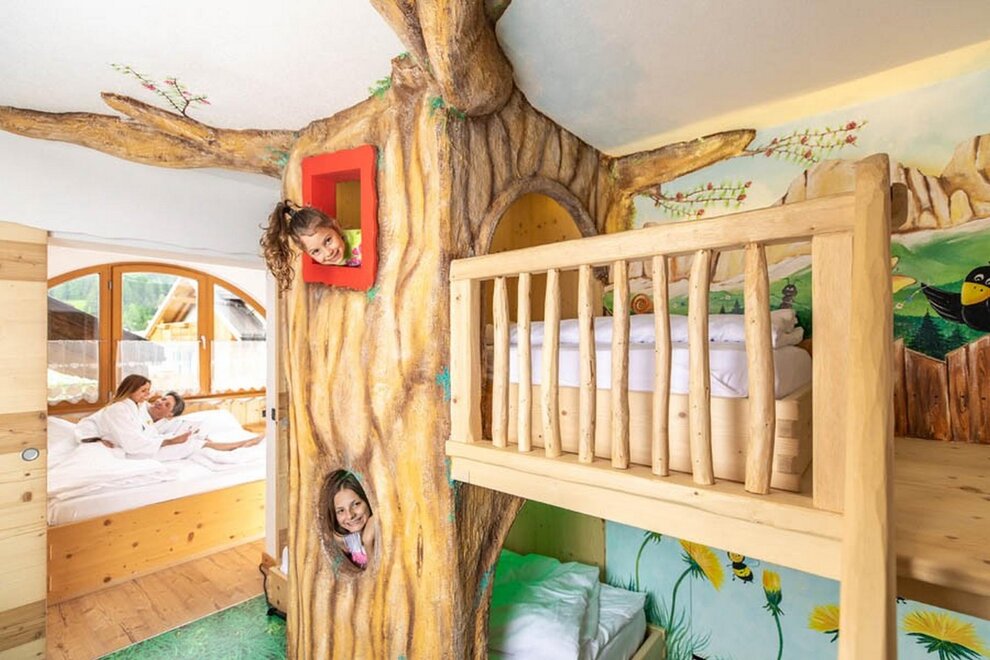 The Squirrel Suite: Sleep with your Mountain Friends Rabbits, birds, butterflies and, obviously, plenty of squirrels await you and your family in our amazing Squirrel Suite! Follow the trail to your children’s room in the company of your new forest friends. Going to bed has never been such fun… especially when the beds are in a tree! The adult room is furnished in the style of a traditional mountain hut. A large French door provides an incredible view in every season.