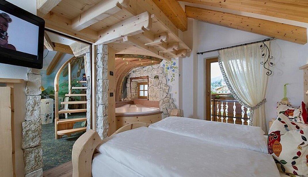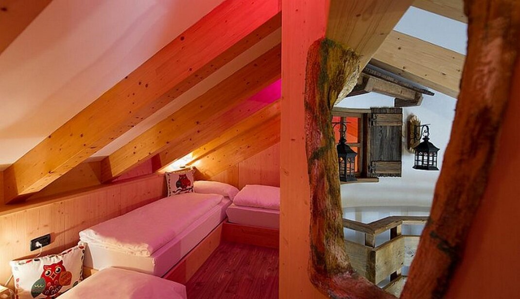 The Owl Suite: A Fairy Tale in an Enchanted Forest Contrary to what some people think, owls bring good luck, and are symbols of knowledge and wisdom. So, we created a suite devoted to these wise wood guardians, where you can play together and respect everyone’s space. In your room, you can walk on a lawn covered with pine needles and climb with your children to a tree house: a small enchanted forest, where you dream even when you are awake! Your children can enjoy the unique experience of sleeping in a tree house in total safety. You and your partner, on the other hand, can enjoy the pleasure of staying in a mountain chalet equipped with every comfort, whirlpool bath and panoramic window on the Dolomites.