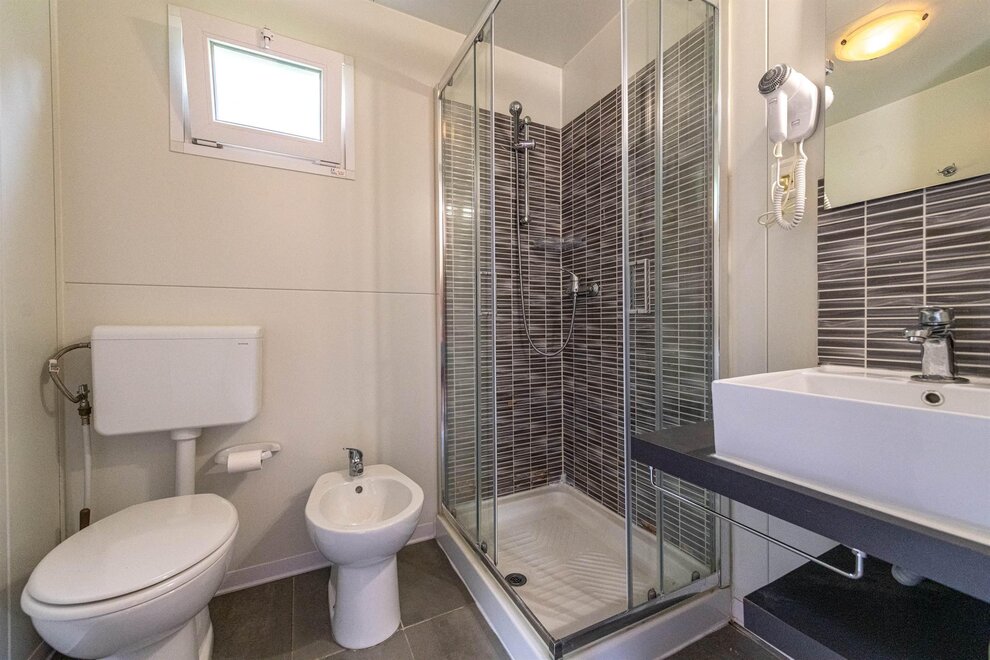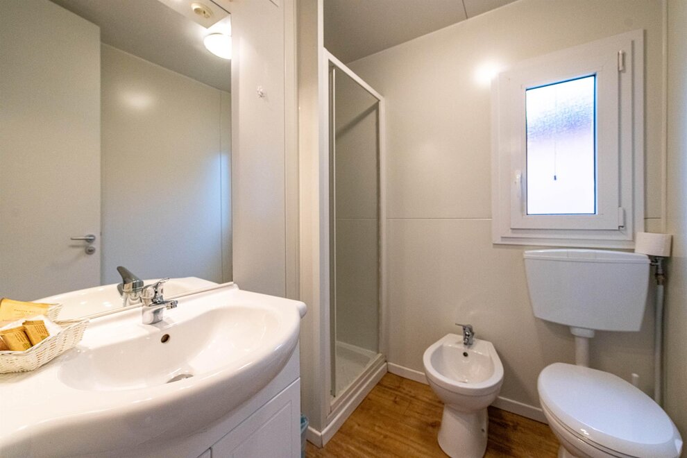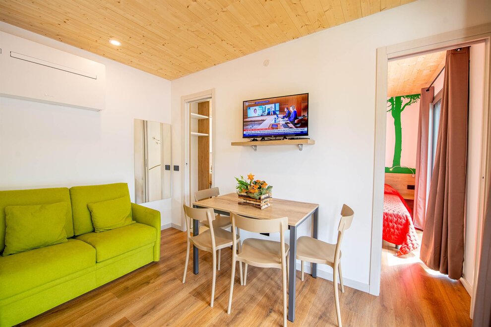 The Ledro Mobile Homes have been designed with the idea of keeping environmental impact at a minimum, while guaranteeing a high level of comfort. Suitable for up to 4 people, they are lighted by large windows opening on to a large covered patio equipped with table and chairs. They have one double bedroom, one bedroom with two single beds, a bathroom with washbasin, toilet, bidet and shower, and a living room with cooking facilities and dishwasher.
