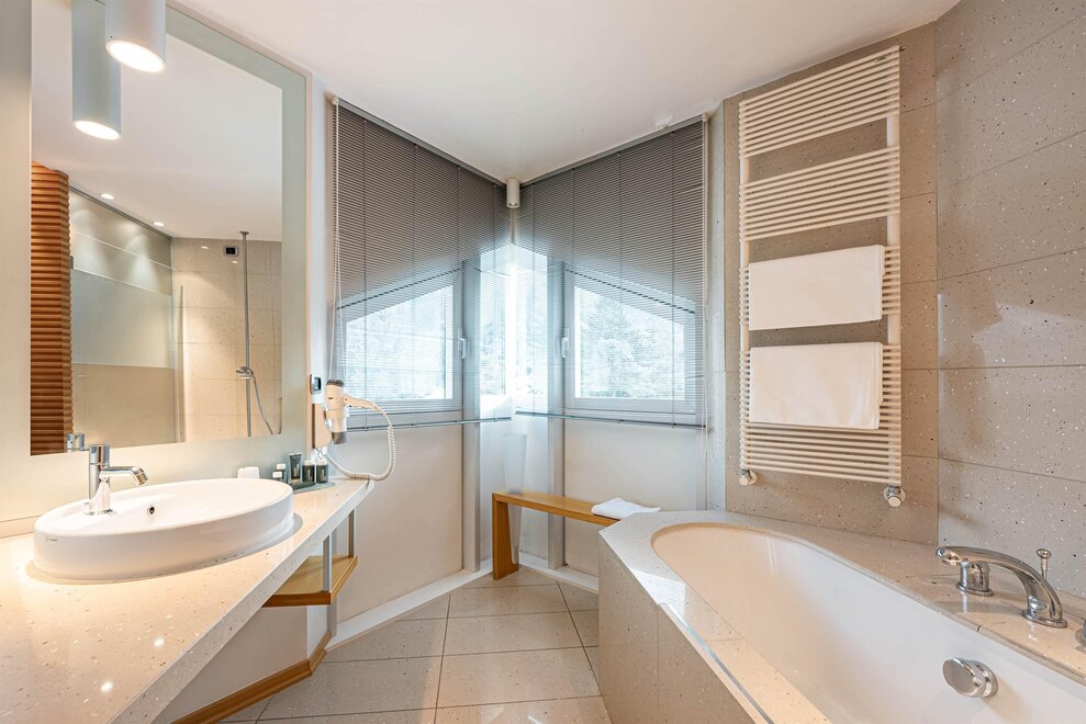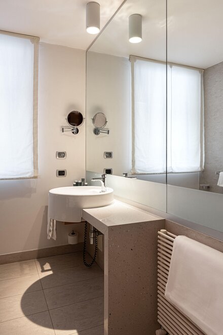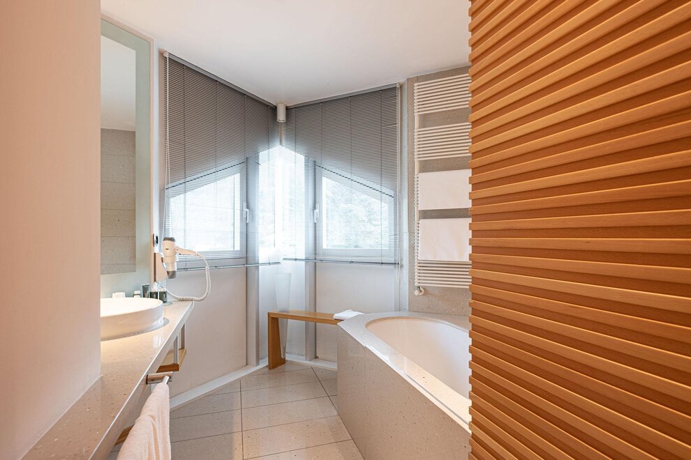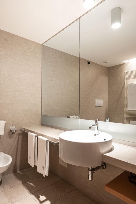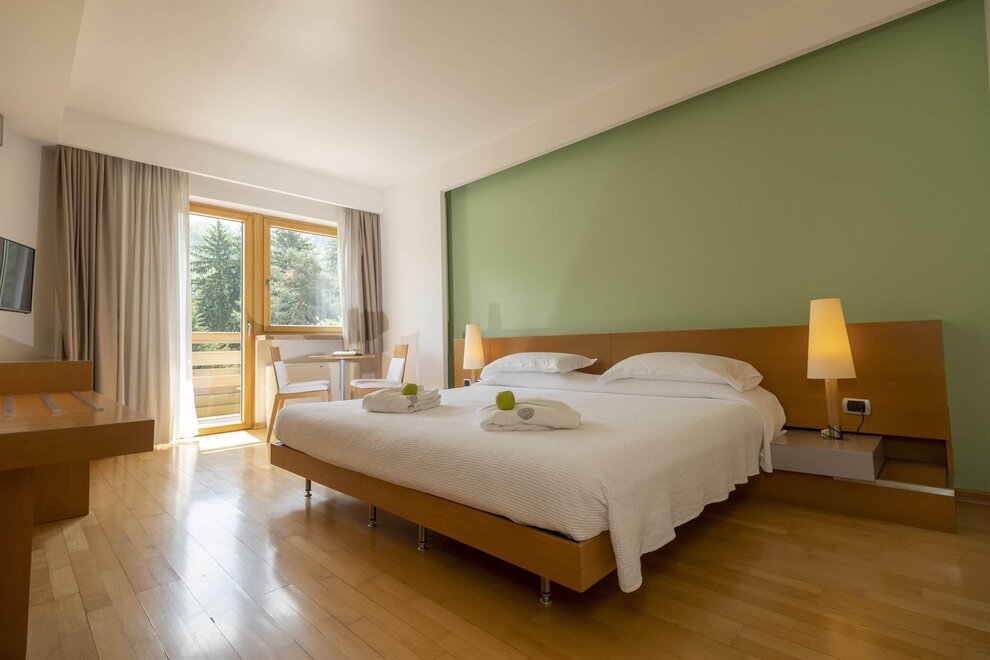 Perfectly balanced between elegance and functionality, each room recalls the hotel typical features. The light plays created by the panoramic windows and the warm colours of wood enhance the large and ergonomic beds. These types of room, with a bathtub, are set up for therapeutic baths with the use of the hot spring waters. Furthermore, staying in these rooms also allows you free access to the Wellness itinerary of our spa, Spa 5 Sensi (upon reservation).