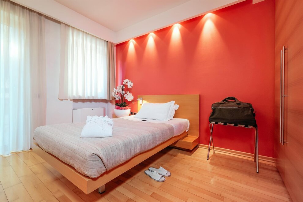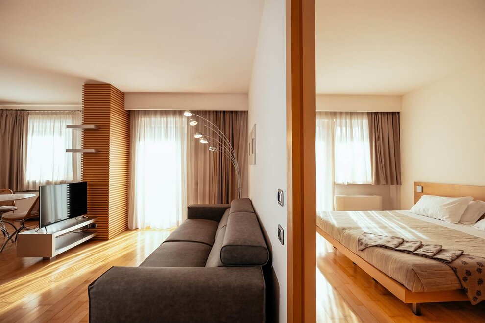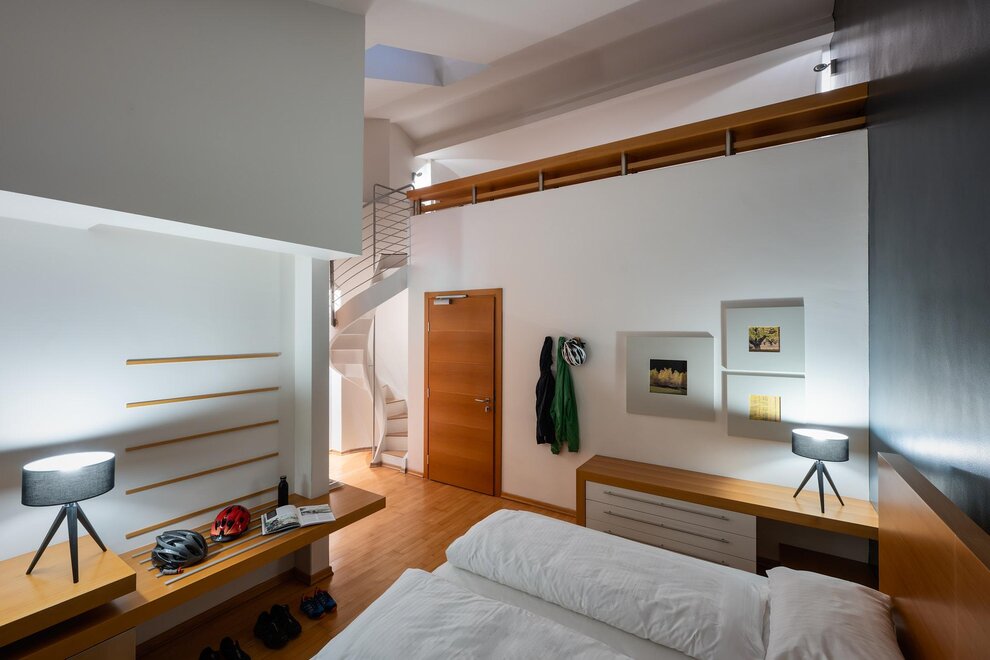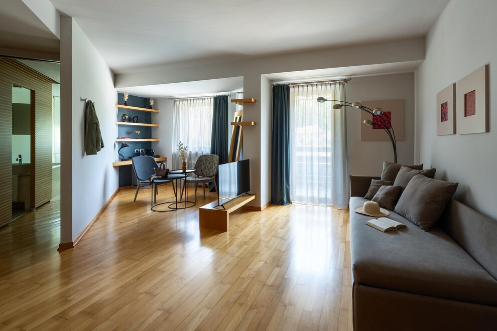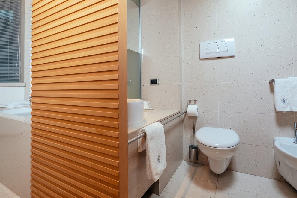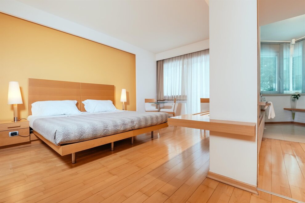 The airy forms and bright spaces are the results of top researched architectonic solutions, which will surprise you for their tasteful details and fine materials.In front of the bed and beside the bathroom door, you will find a roomy wardrobe. The bathroom is provided with windows and a bathtub for balneotherapy.