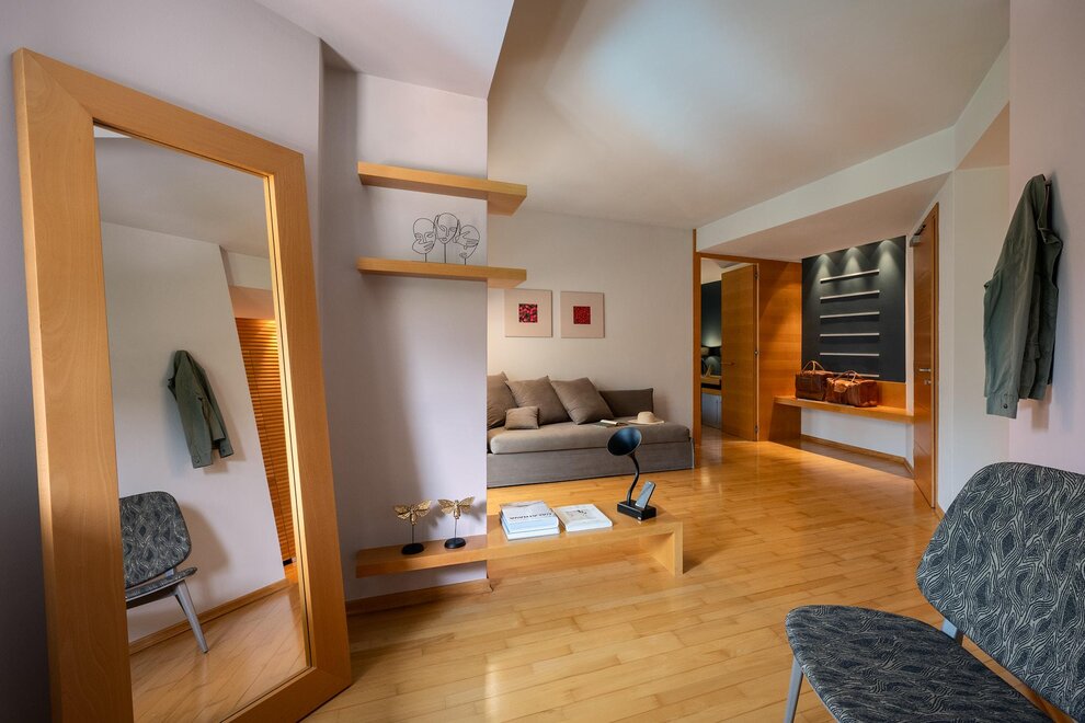 Perfectly balanced between elegance and functionality, each room recalls the hotel typical features. The light plays created by the panoramic windows and the warm colours of wood enhance the large and ergonomic beds.