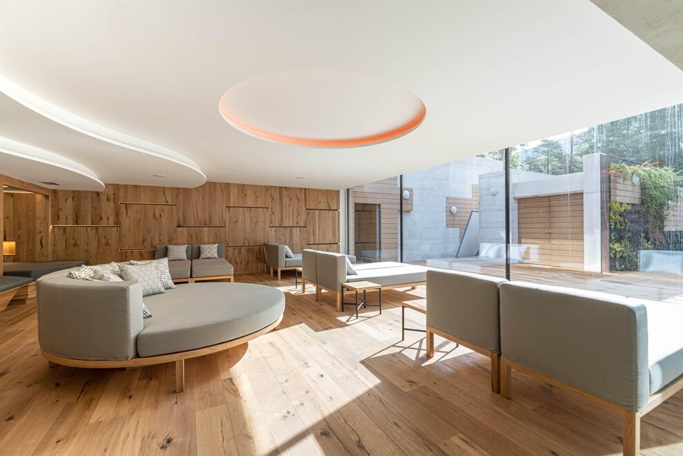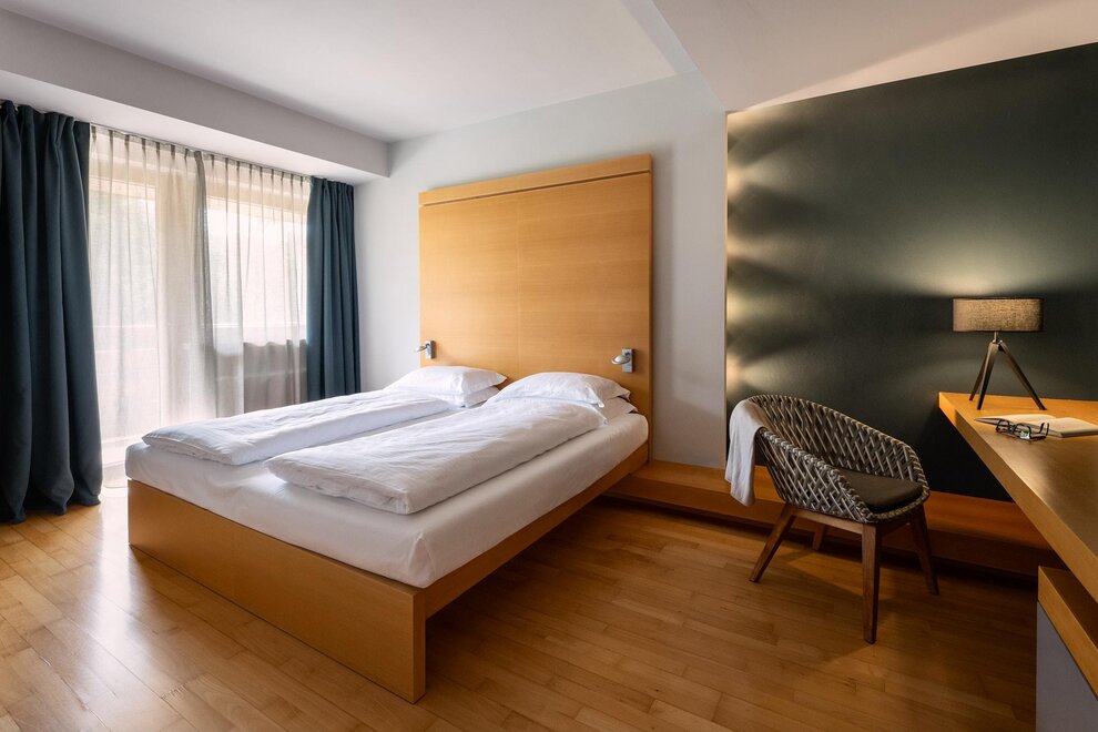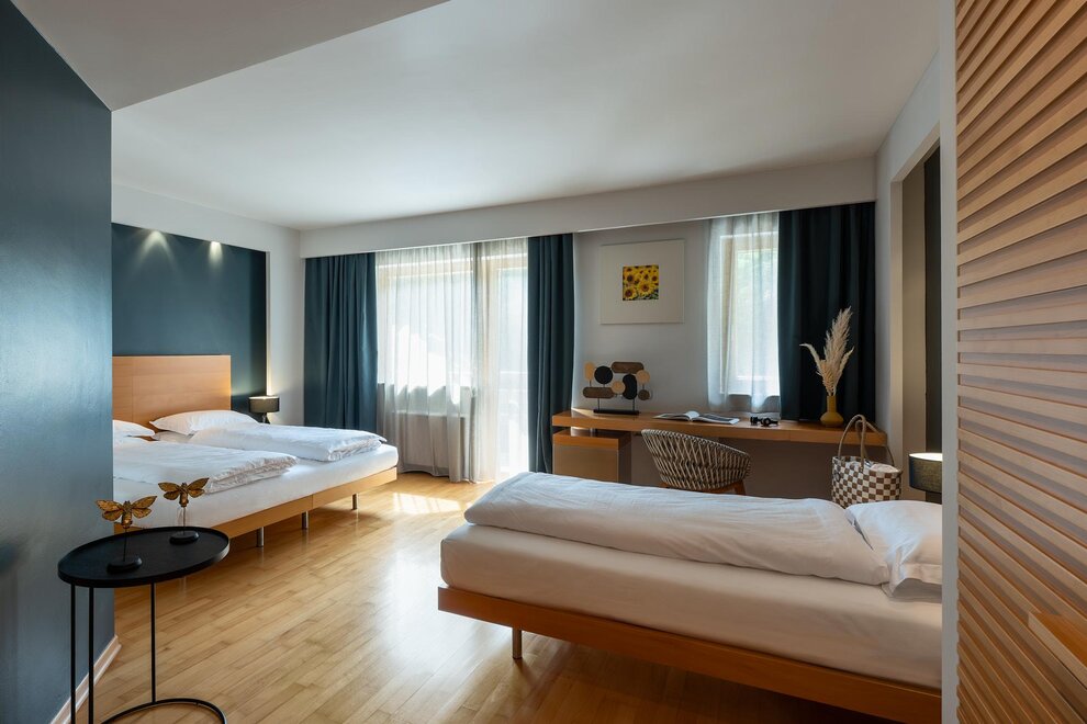 In a privileged position and overlooking the breathless Comano Parc and the outdoor pool, the Deluxe Rooms are arranged with a large walk-in wardrobe, private balcony, windowed bathroom and a herbal teas corner to complete a full relax. A covered garage is included. This kind of room is arranged with a bath for the balneotherapy and includes the SPA access (on reservation).