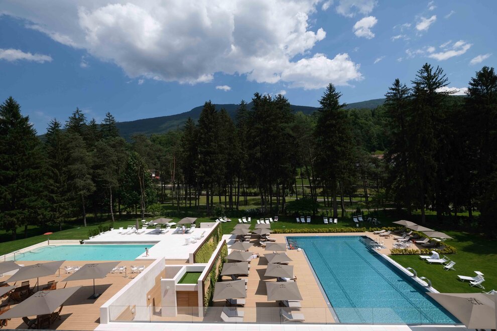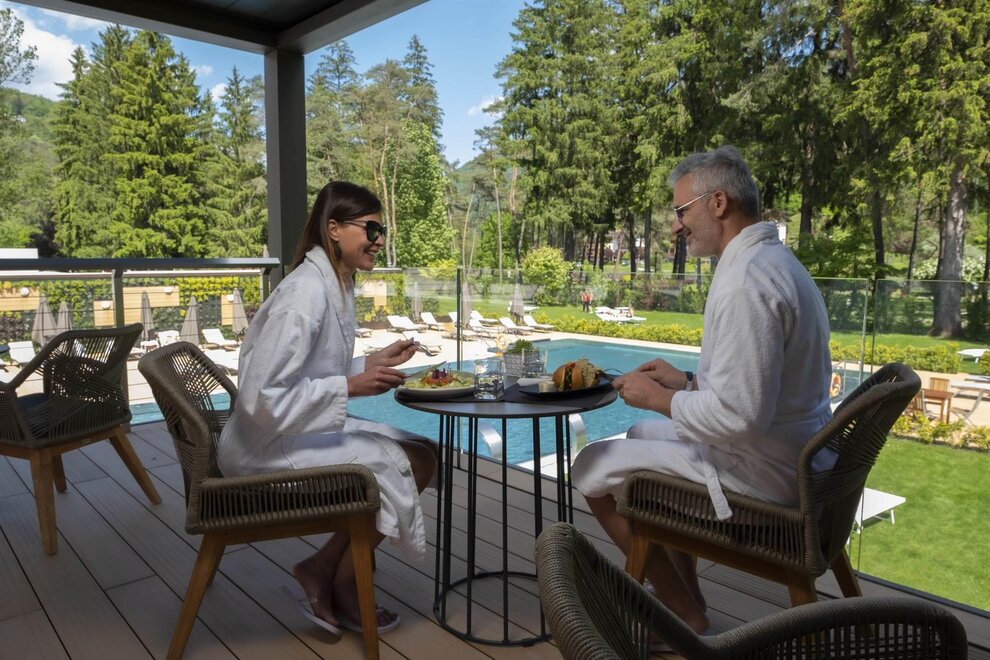 - Spacious and elegant outdoor relaxing areas with sunbeds in the nature of the thermal park under ancient trees or by the pool.