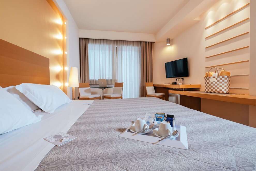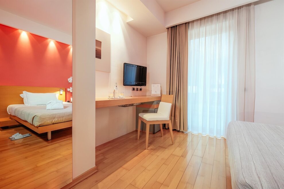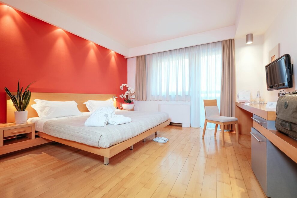 These types of room, with a bathtub, are set up for therapeutic baths with the use of the hot spring waters. Furthermore, staying in these rooms also allows you free access to the Wellness itinerary of our Thermal Spa (upon reservation).The airy forms and bright spaces are the results of top researched architectonic solutions, which will surprise you for their tasteful details and fine materials.In front of the bed and beside the bathroom door, you will find a roomy wardrobe. The bathroom is provided with windows and a bathtub for balneotherapy.