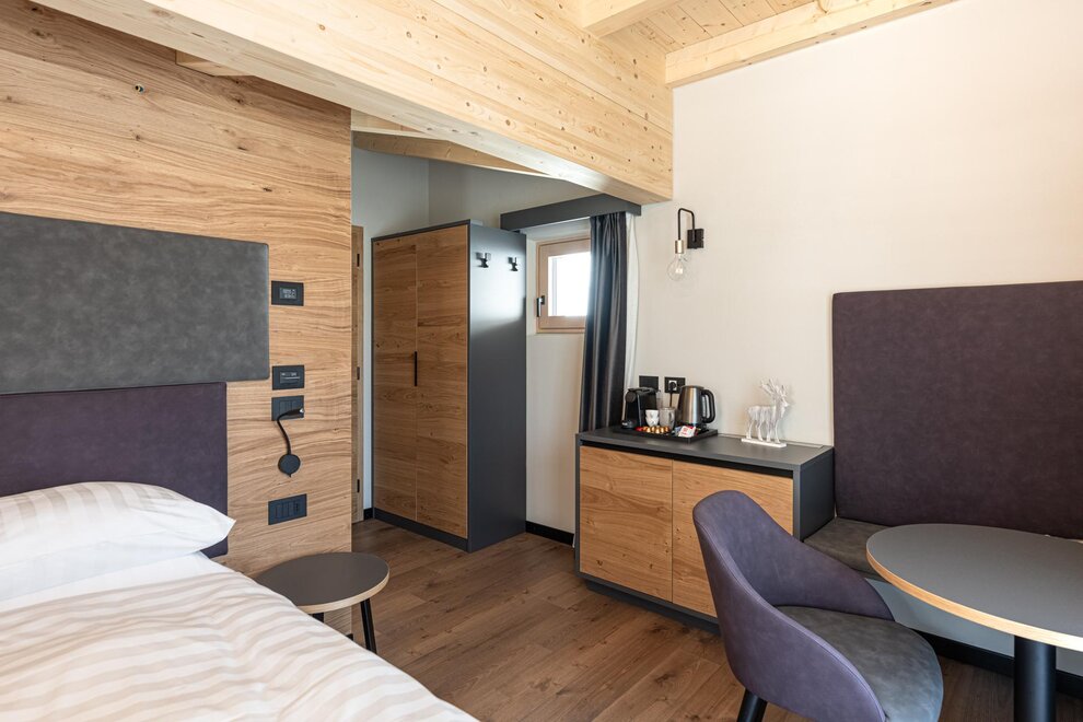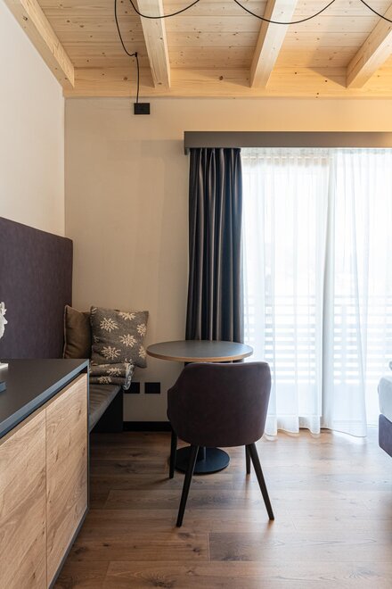 Junir Suite with oak furnishings and a view of the Piz Meda...
