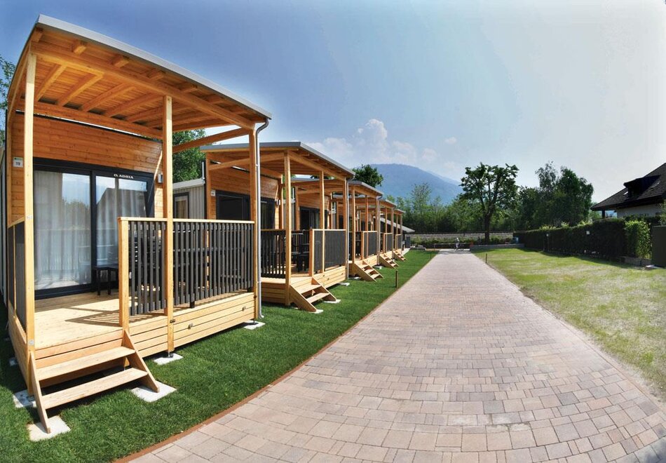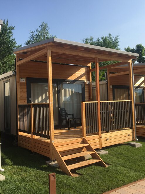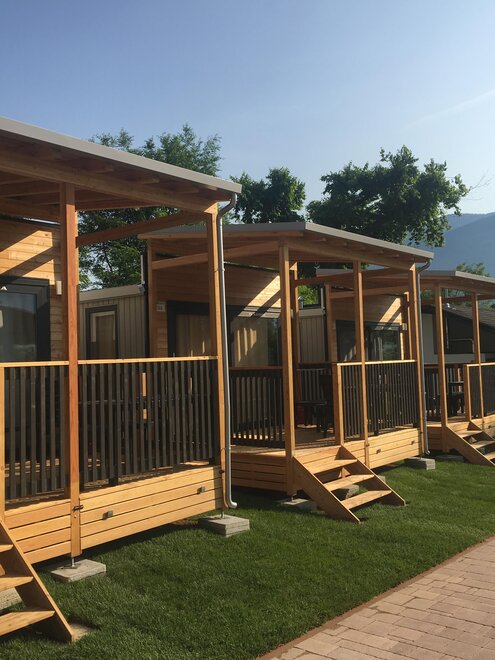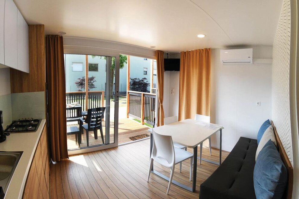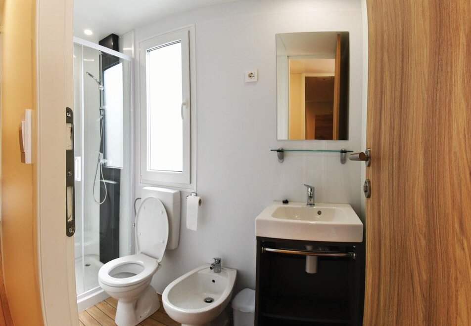 They measure 8.5 x 4 meters, are composed of living room with dinette and kitchenette, large double bedroom with double bed and possibility of a cot space, bedroom with three single beds, bathroom with shower, sink, toilet and bidet. All supplied with kitchen equipment, pillows, blankets, air conditioning and heating, TV and microwave oven as well as a cozy outdoor wooden veranda with parapet and roof over the entire surface, with outdoor table and chairs. Each mobile home has a reserved parking space available.Room/apartment features