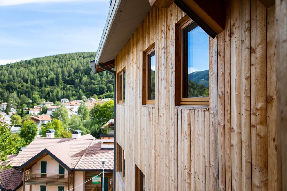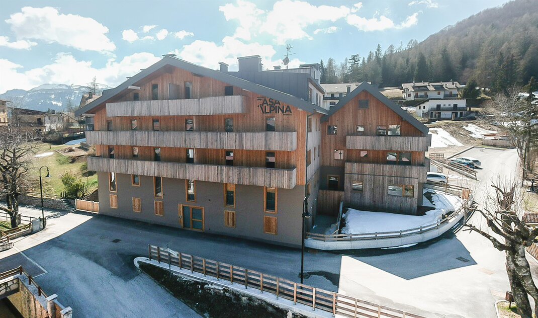 Casa Alpina is a new and refined Residence Hotel***S in Serrada, located in the heart of the Alpe Cimbra at the start of numerous hiking trails and just 400 meters from the Serrada-Martinella ski lift, connected to the Folgaria-Fiorentini Ski Area. Its 12 bright apartments are divided into two-room, three-room and duplex apartments equipped with all the best comforts: two bathrooms (in the three-room and duplex apartments), large bedrooms, equipped kitchenette with large living room and sofa bed, TV, washing machine, dishwasher, hairdryer, kettle, independent heating and WI-FI network. Bed, kitchen and bathroom linen included. The bistro, the breakfast room (by reservation), the ski & bike room, the fitness area, the garden-solarium and the covered garage (on request) complete the offer.