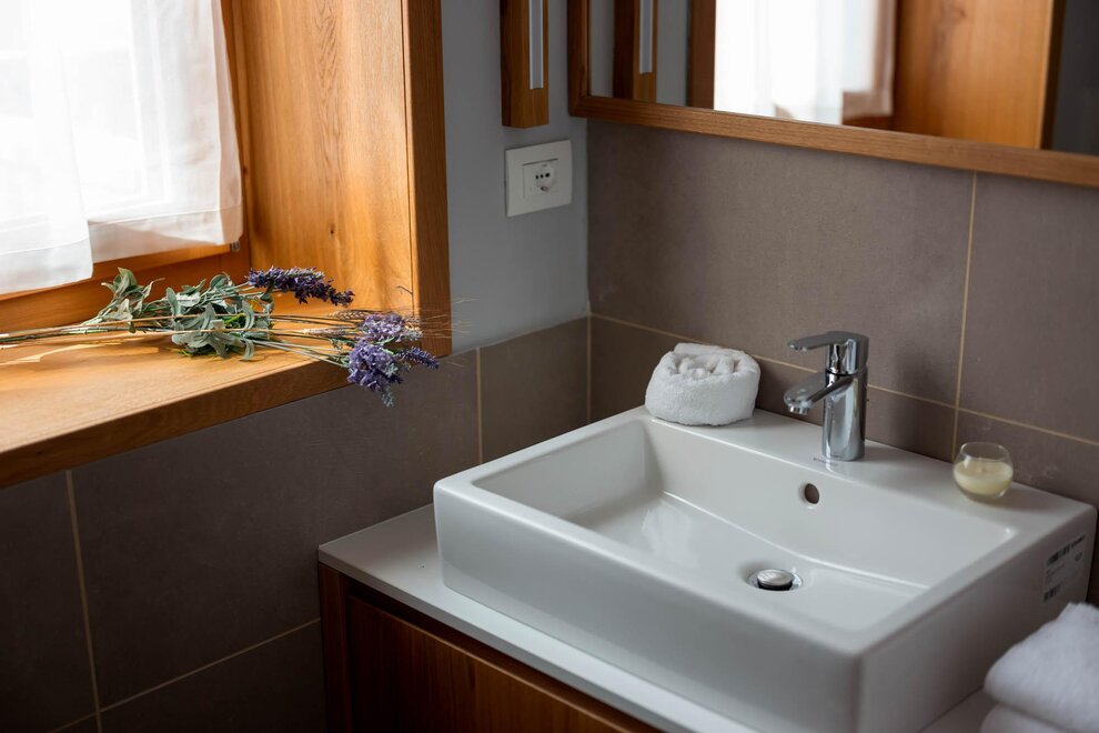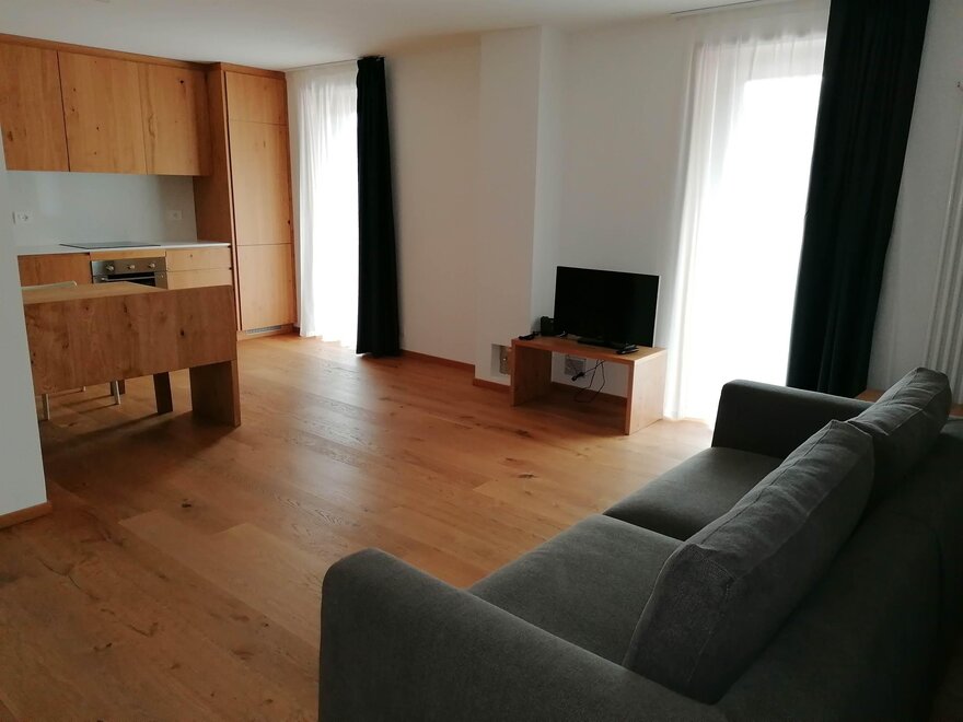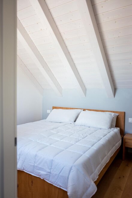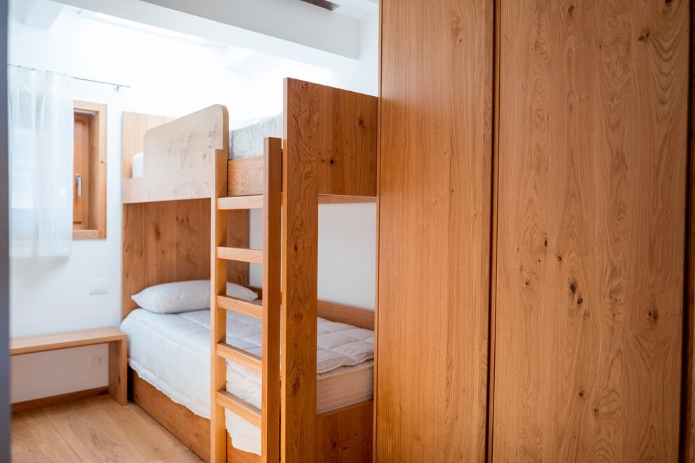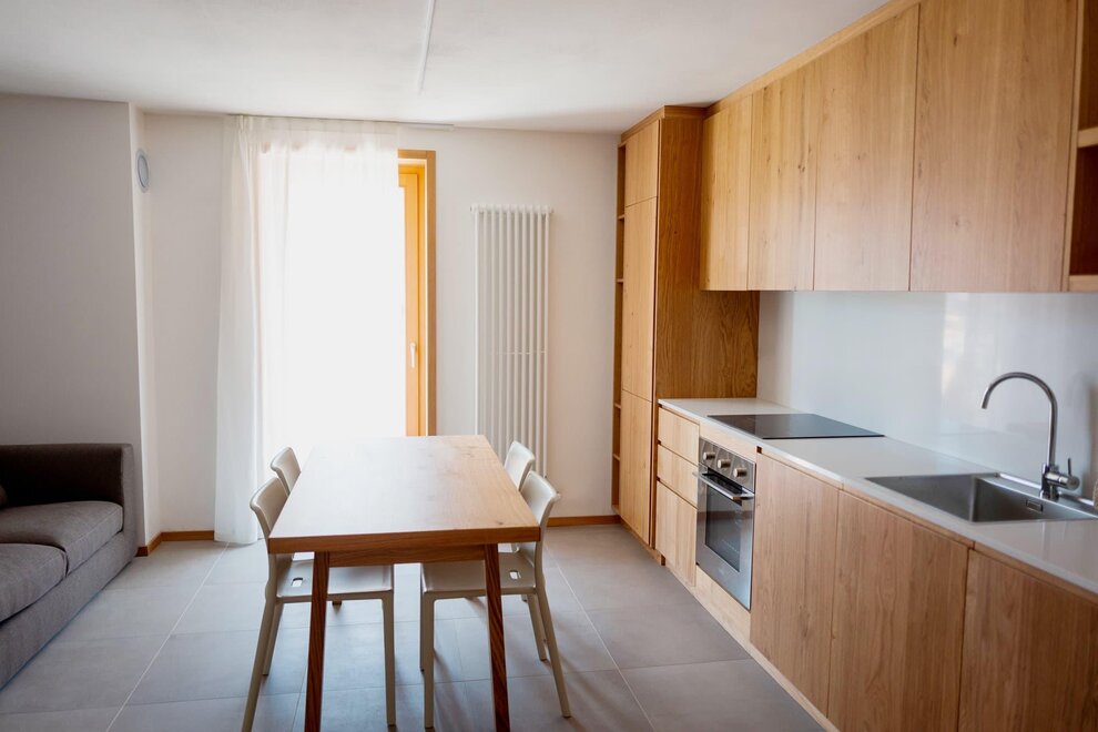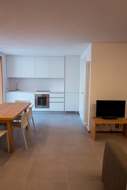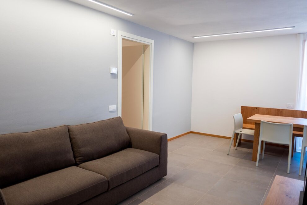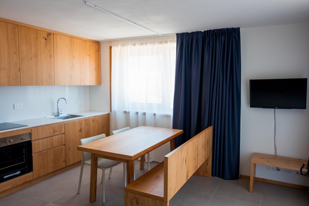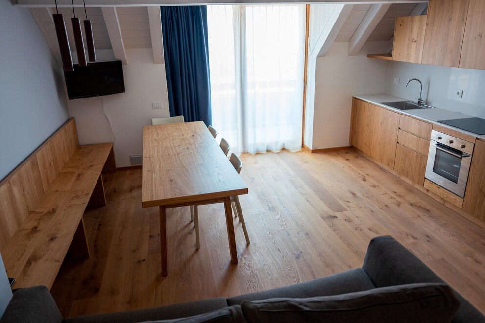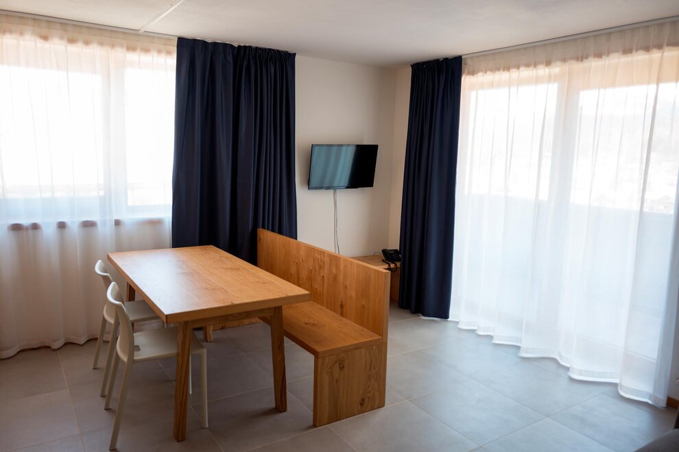 These bespoke apartments, perfect for those looking for intimacy, have areas up to 48 square metres. Two adjectives describe them perfectly: bright and carefully decorated. They have a double bedroom with large wardrobe, bathroom with shower and washing machine, and a living area with kitchen, built-in dishwasher, satellite TV, phone, and sofa bed. In our two-room apartments the light and landscapes of Alpe Cimbra always find a window to enter through, making every moment unforgettable.