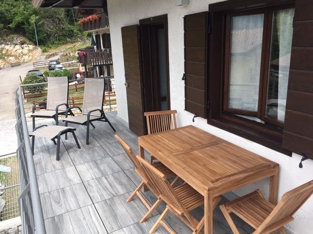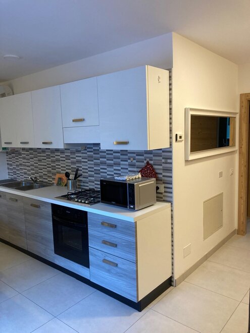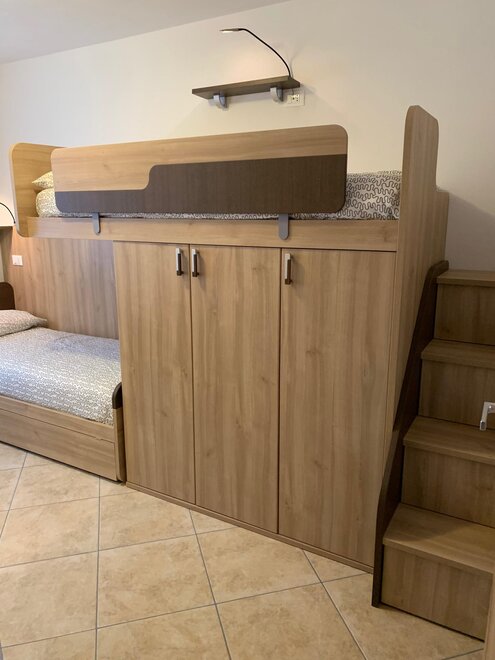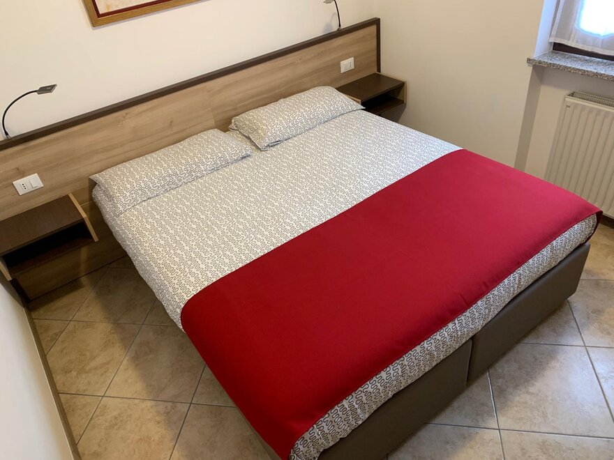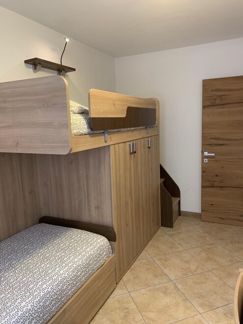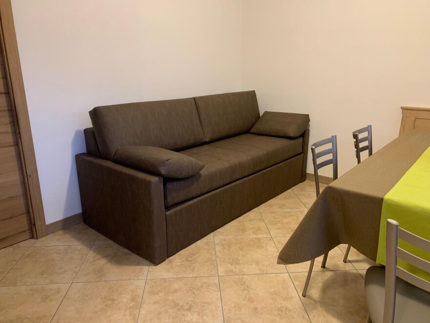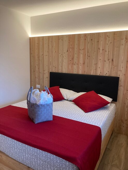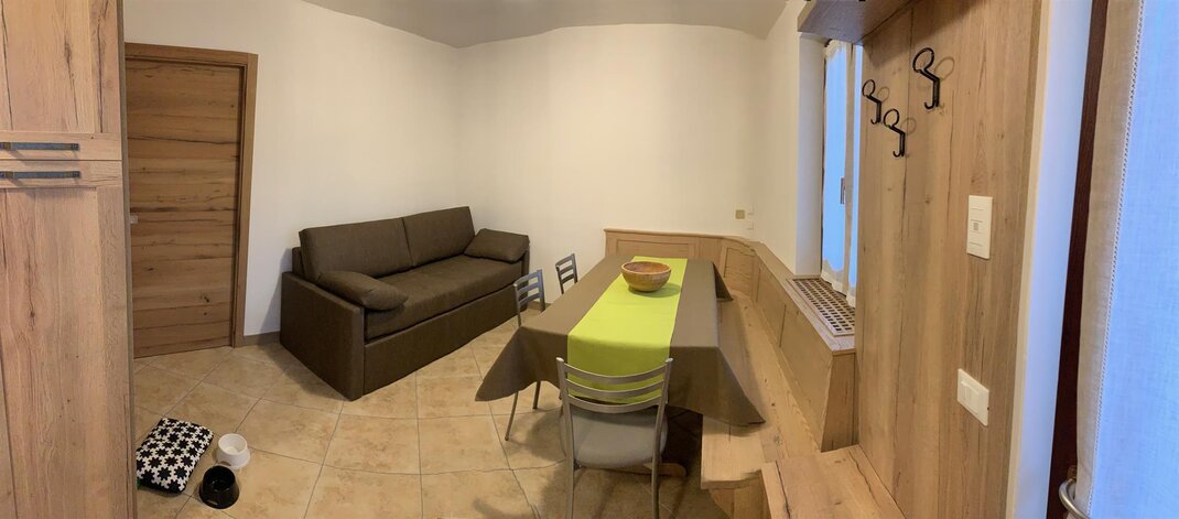 Renovated apartments on the first floor with terrace, all furnished in rustic Alpine style, bookable for 2 to 5 beds; bathroom with shower, toilet, bidet, hairdryer, complete set of towels and courtesy set, outdoor furniture with table, chairs and deckchairs to enjoy lunch and dinner outdoors. In the shared garden there is also a barbecue for excellent grilling. The living room is equipped with a sofa bed, satellite TV, kitchenette with induction hob, fridge, microwave oven, dishwasher, crockery and cookware, utensils, kitchen linen, free WI-FI throughout the facility.