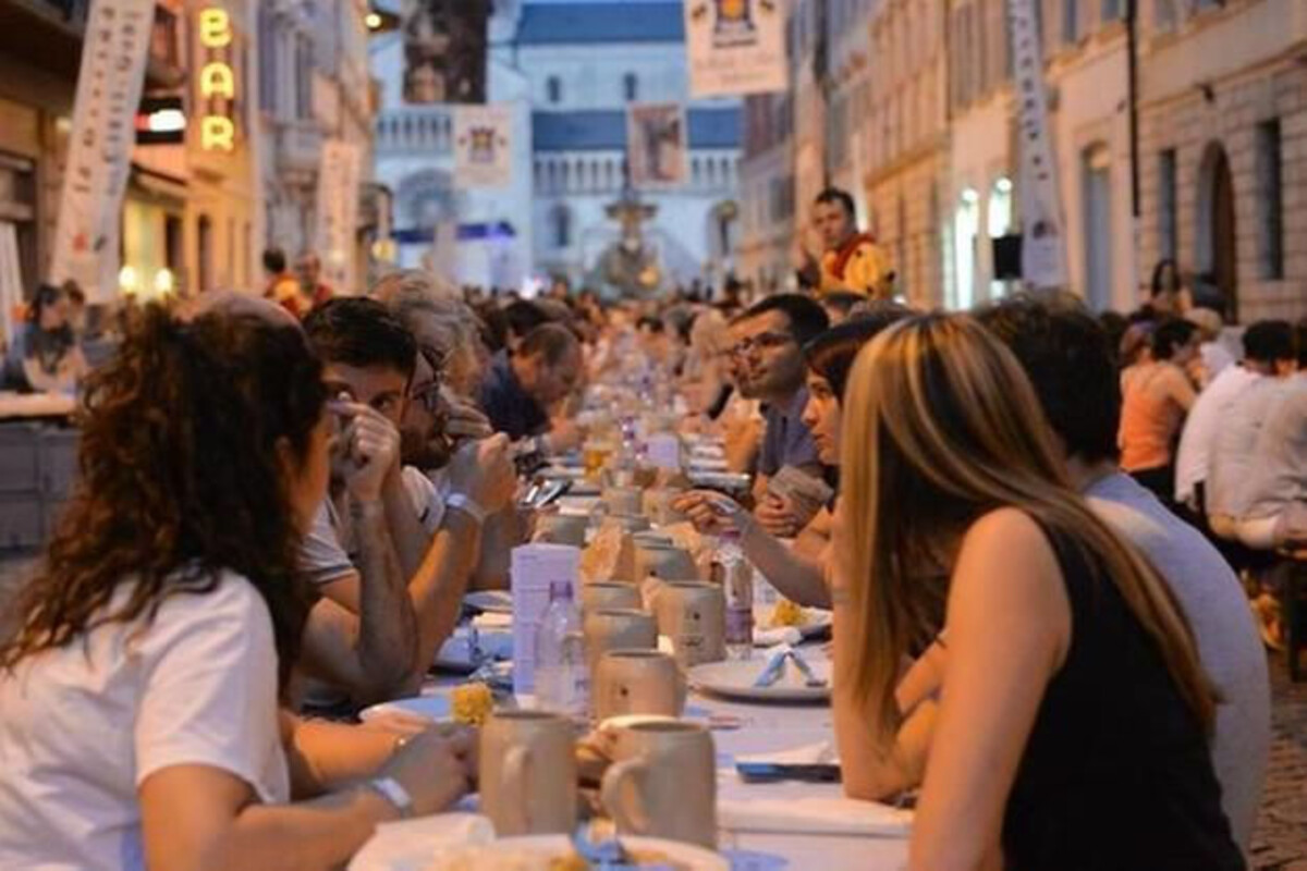 180 volunteers prepare and serve dinner just for you: a dip in the Middle Ages among costumes and typical dishes. We all dine together as it was then when, at the completion of an important work, we gathered to celebrate. To call it a "dinner" would be really reductive, you have to try it!