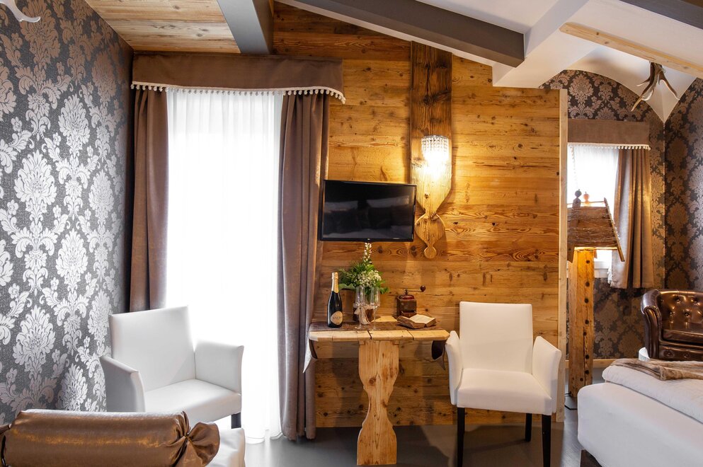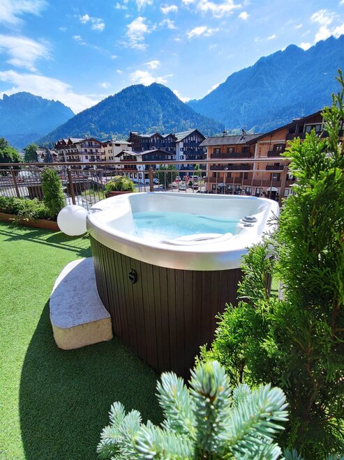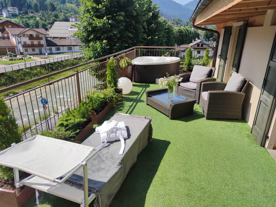 For those who don't want to miss anything. Suite with large terrace and private heated whirlpool tub overlooking the Pale di San Martino.