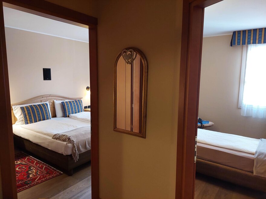 The hotel was completely refurbishes in 2002 and nestles in the heart of Fiera di Primiero, in a quiet location at 100m from the indoor swimming baths, with stunning view of Pale di S. Martino. It disposes of a hall, reception, bar with wine cellar, breakfast room in rustic style and a private car park. The meals are served in the nearby Hotel Relais Orsingher (50m). The rooms and apartments feature en-suite facilities, DD phone, radio, satellite TV and safe. The standard rooms are furnished in country style, while the comfort rooms dispose of a balcony with stunning views. The junior suites have a living unit, kitchenette and a gorgeous view. The 2-room apartments feature 4 beds, living room with bed settee, kitchenette, double room with additional bed and en-suite facilities.